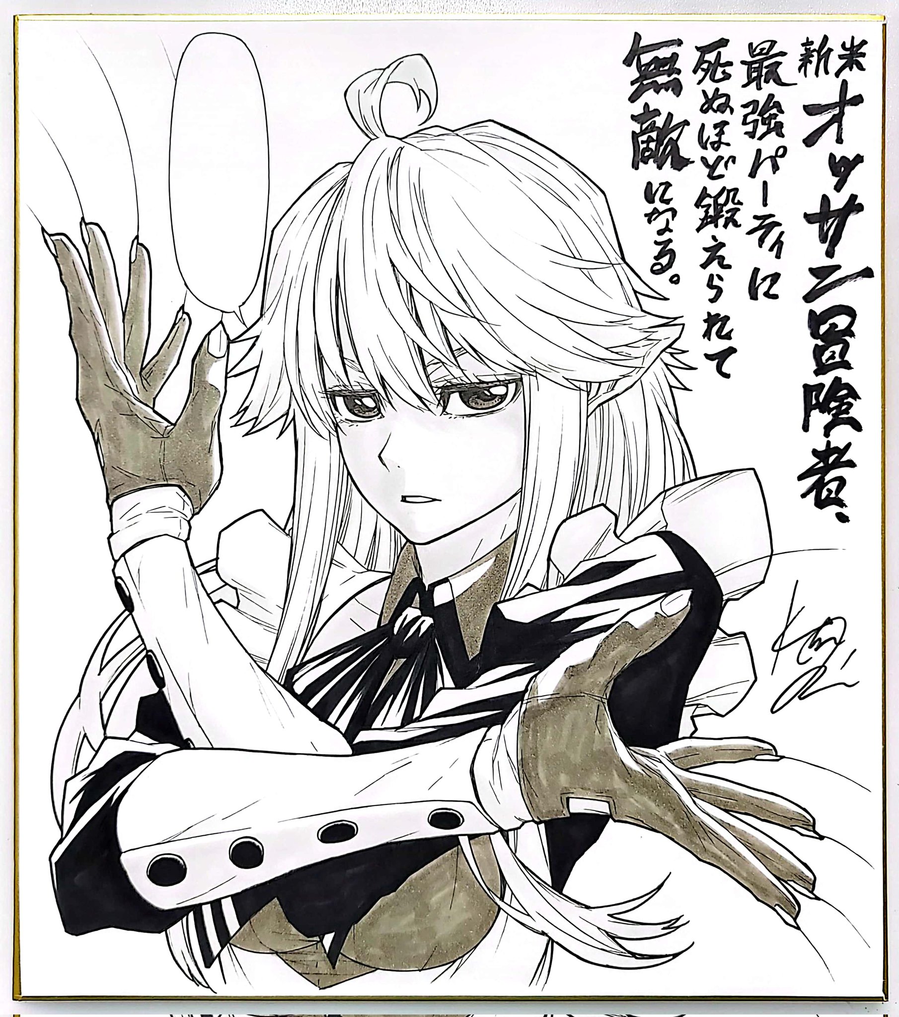 1girl ahoge armor black_gloves gloves highres japanese_text long_hair looking_at_viewer ogino_ken open_mouth reanette_elfelt serious shinmai_ossan_bokensha simple_background solo white_background white_hair