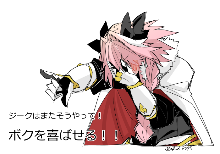 1boy astolfo_(fate) astolfo_(rider)_(fate) black_bow black_shirt blush bow braid cape fang fate/apocrypha fate_(series) fur-trimmed_cape fur_trim gauntlets hair_bow hair_intakes hand_on_own_face haoro long_braid long_hair male_focus multicolored_hair pink_hair pointing purple_eyes shirt signature simple_background single_braid skin_fang solo streaked_hair trap two-tone_hair upper_body white_background white_cape white_hair