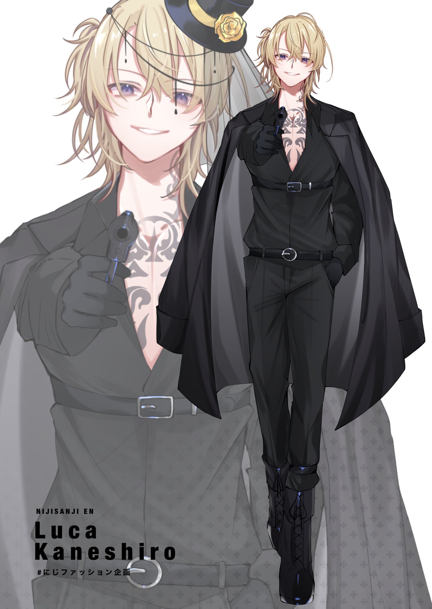 1boy aiming aiming_at_viewer alternate_costume belt belt_buckle black_belt black_boots black_coat black_gloves black_hat black_pants black_shirt black_veil blonde_hair boots buckle character_name chest_harness chest_tattoo coat coat_on_shoulders collared_shirt flower gloves gun hair_between_eyes hand_in_pocket handgun harness hat hat_flower highres holding holding_gun holding_weapon lace-up_boots long_sleeves looking_at_viewer luca_kaneshiro male_focus medium_hair mini_hat mini_top_hat nijisanji nijisanji_en one_side_up pants parted_lips partially_unbuttoned pectoral_cleavage pectorals purple_eyes rose shirt smile solo tattoo top_hat veil virtual_youtuber weapon white_background yellow_flower yellow_rose yukishiro_(boma_winter)