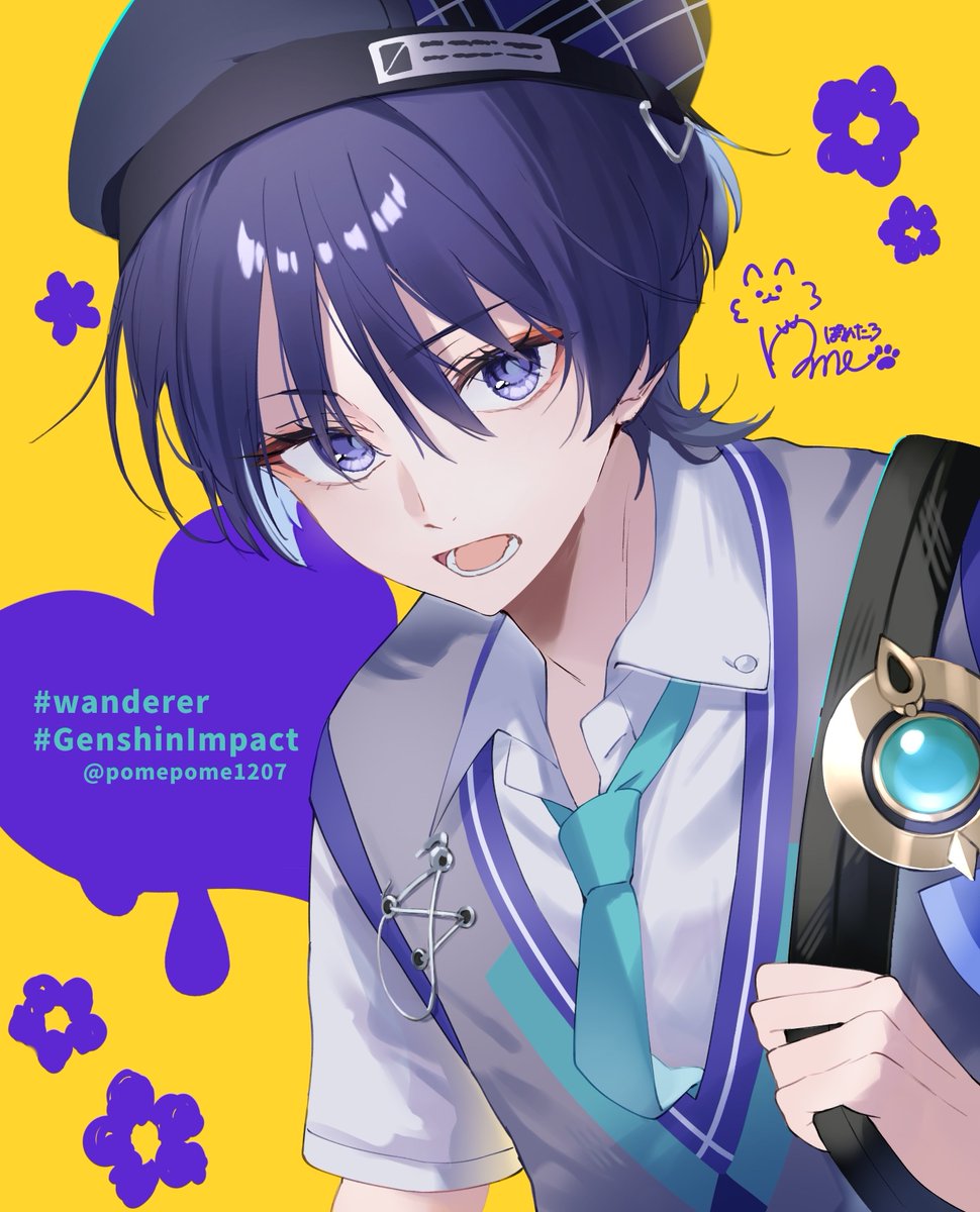 1boy alternate_costume aqua_necktie aqua_trim beret blue_trim blunt_ends character_name collared_shirt eyeliner eyeshadow floral_print flower genshin_impact grey_vest hair_intakes hashtag hat highres looking_at_viewer lower_teeth_only makeup male_focus multicolored_vest neck necktie official_alternate_costume open_mouth pomepome1207 purple_eyes purple_flower purple_hair red_eyeliner scaramouche_(genshin_impact) shirt short_sleeves solo teeth twitter_username vest vision_(genshin_impact) wanderer_(genshin_impact) wanderer_(mega_mgc_coffee)_(genshin_impact) white_shirt white_sleeves yellow_background
