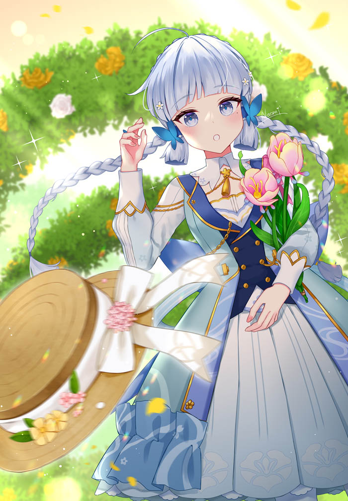 1girl ayaka_(genshin_impact) blue_eyes blue_hair blunt_bangs braid brown_hat butterfly_hair_ornament collar flower genshin_impact hair_down hair_flower hair_ornament hair_ribbon hat holding holding_flower kamisato_ayaka kamisato_ayaka_(springbloom_missive) light_blue_hair light_blush long_sleeves mole mole_under_eye naomi_(fantasia) official_alternate_costume parted_lips puffy_long_sleeves puffy_sleeves ribbon solo twin_braids unworn_hat unworn_headwear white_collar white_ribbon