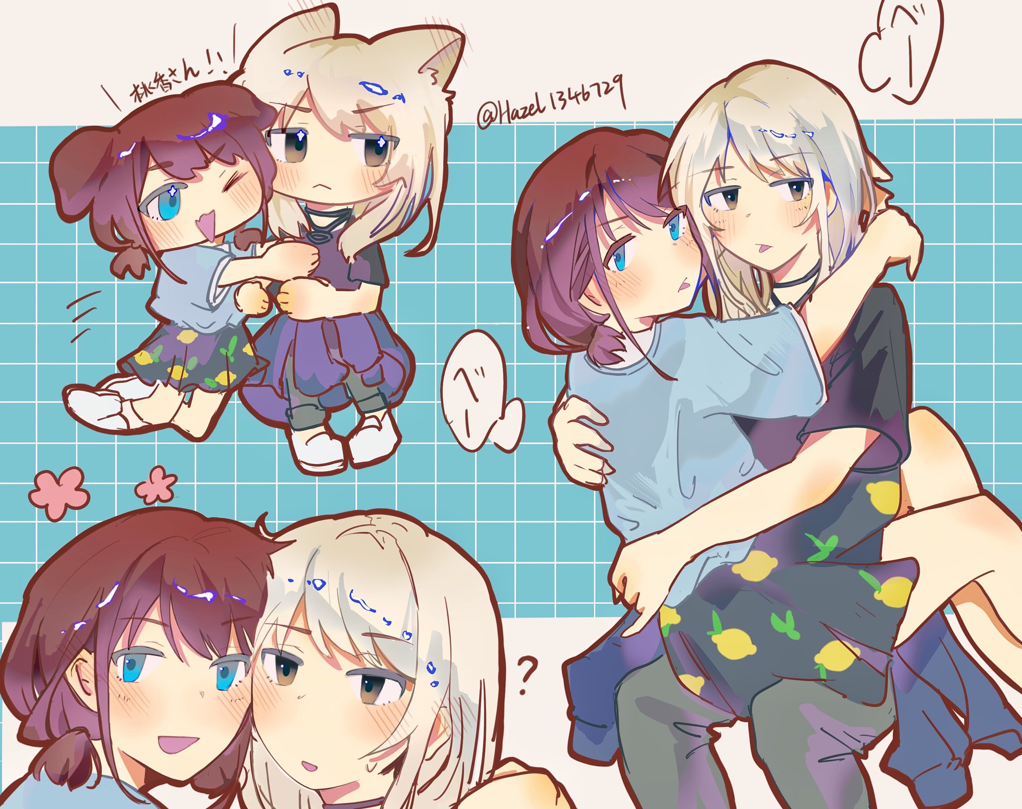 2girls ? animal_ears arms_around_neck black_shirt black_skirt blue_background blue_eyes blue_shirt blush brown_pants cheek-to-cheek chinese_commentary commentary_request dog_ears food_print fruit_print girls_band_cry grey_eyes grid_background hand_on_another's_back hand_on_another's_waist hazel1346729 heads_together highres iseri_nina jewelry kawaragi_momoka kemonomimi_mode lemon_print light_brown_hair long_hair multiple_girls necklace open_mouth pants print_skirt red_hair shirt short_sleeves short_twintails sitting sitting_on_lap sitting_on_person skirt smile tongue tongue_out twintails twitter_username white_footwear yuri