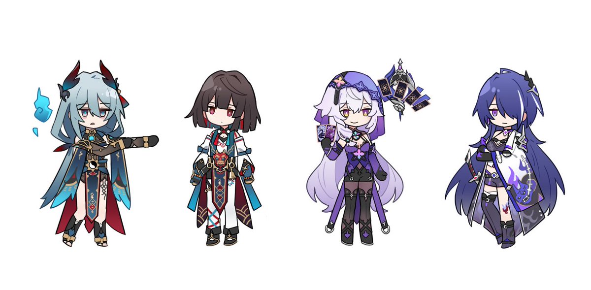 4girls acheron_(honkai:_star_rail) asymmetrical_footwear bell black_choker black_gloves black_shorts black_swan_(honkai:_star_rail) boots brown_hair card chain chibi chibi_only choker coat coattails detached_sleeves feathers gloves hair_ornament hair_over_one_eye hanya_(honkai:_star_rail) holding holding_card honkai:_star_rail honkai_(series) leg_tattoo long_hair midriff multicolored_eyes multicolored_hair multiple_girls pantyhose purple_eyes purple_hair purple_veil red_eyes scabbard sheath sheathed shidare_(youh4016) short_hair short_shorts shorts single_bare_shoulder standing streaked_hair sword tailcoat tattoo thigh_boots veil weapon white_background white_coat white_pantyhose xueyi_(honkai:_star_rail)