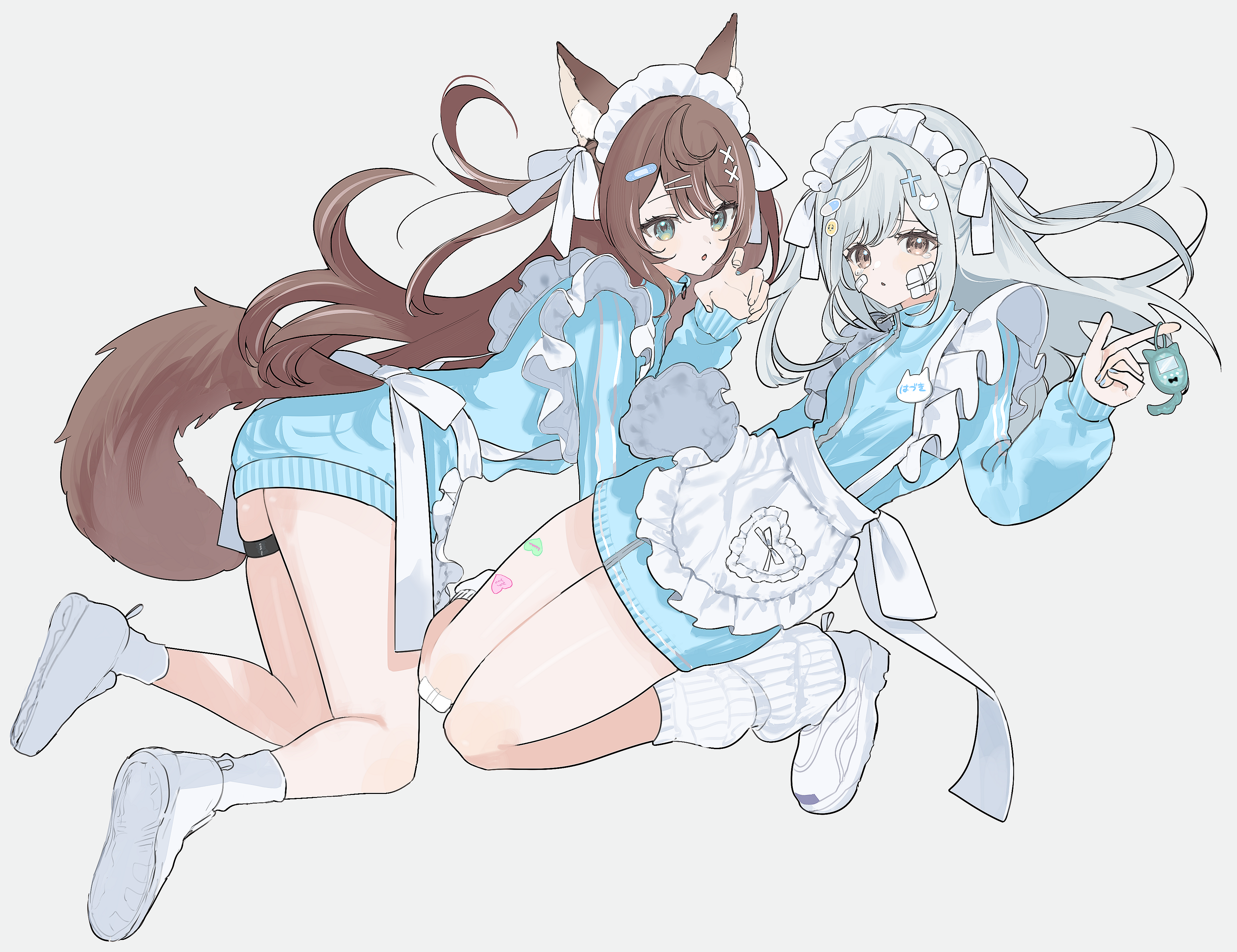 2girls absurdres animal_ears apron blue_jacket brown_eyes floating_hair fox_ears fox_tail grey_hair hair_ribbon hazuki_(mechiru) highres jacket jersey_maid jumping leg_warmers long_hair long_sleeves looking_at_viewer maid maid_apron maid_headdress mechiru multiple_girls original parted_lips ribbon shoes simple_background sneakers tail tamagotchi tamagotchi_(virtual_pet) tenshi_kaiwai thighs two_side_up unconventional_maid virtual_pet_(toy) white_apron white_background white_footwear white_leg_warmers white_ribbon