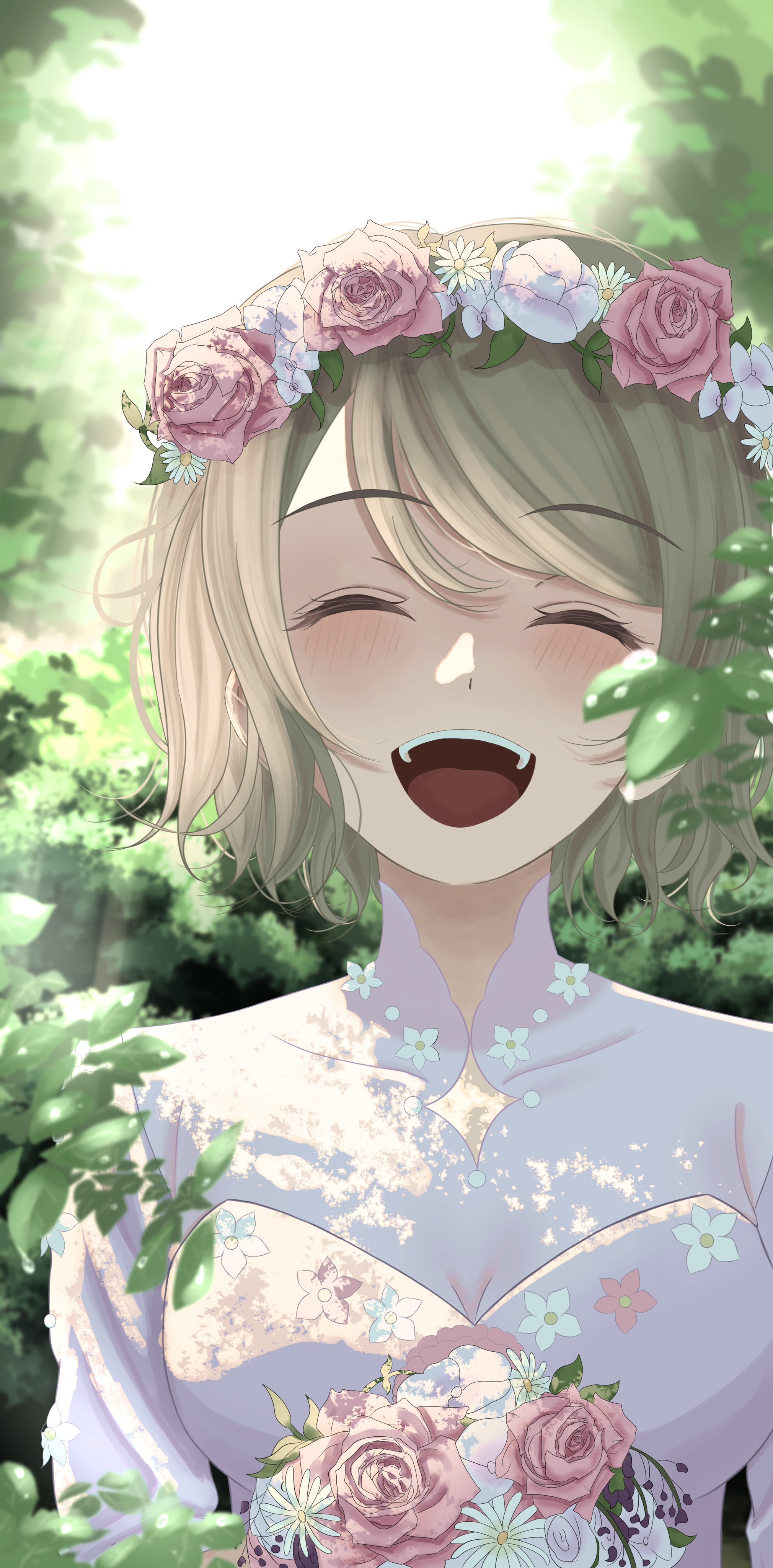 1girl absurdres bouquet breasts brown_hair bush cleavage closed_eyes dress flower hair_flower hair_ornament hana_y_chan head_wreath highres holding holding_bouquet leaf love_live! love_live!_sunshine!! open_mouth outdoors short_hair sunlight teeth tree vegetation watanabe_you wavy_hair