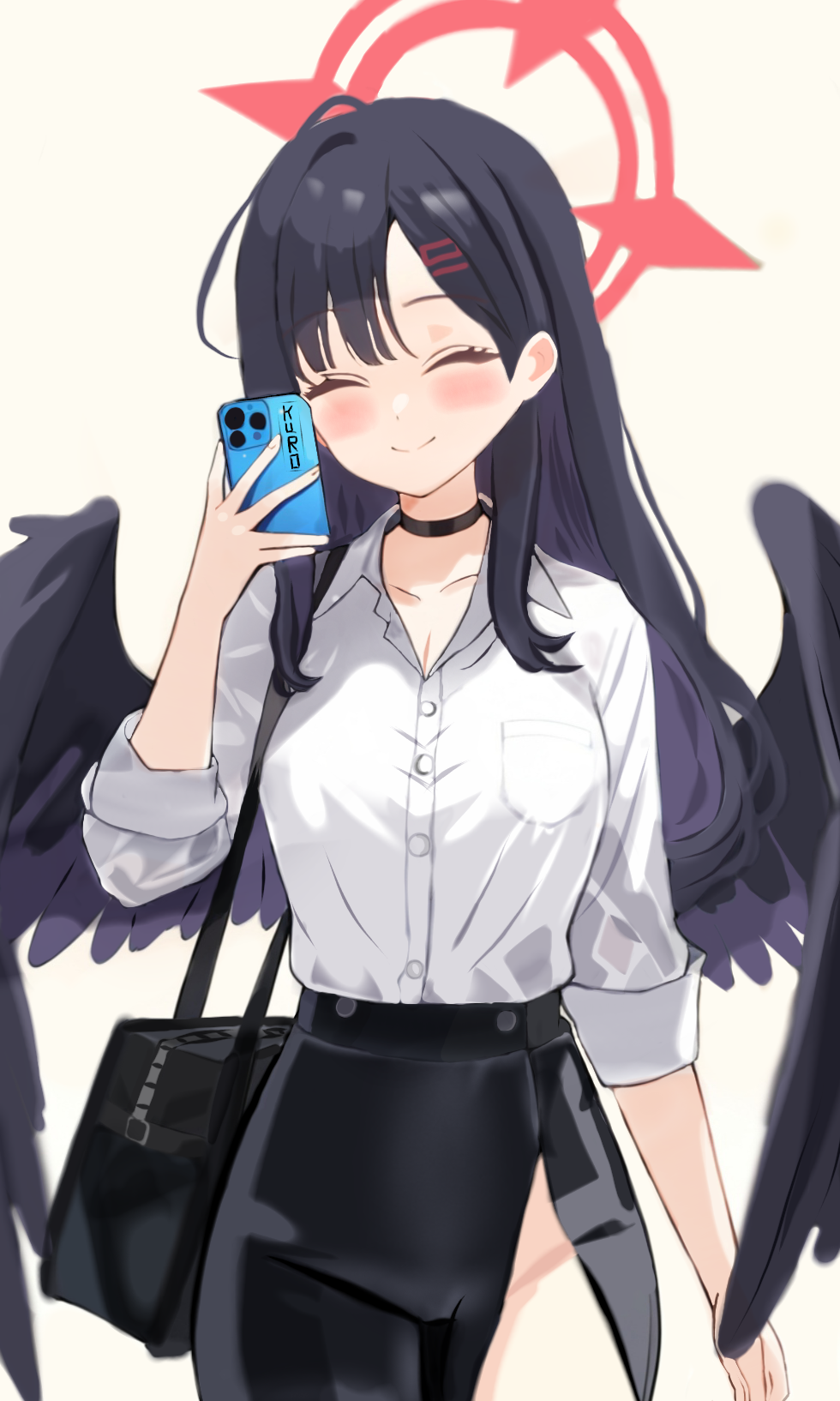 1girl black_bag black_choker black_skirt black_wings blue_archive blush cellphone choker closed_eyes closed_mouth collared_shirt commentary facing_viewer feathered_wings formal_clothes hair_ornament hairclip halo highres holding holding_phone ichika_(blue_archive) kurogami_fuyuki low_wings md5_mismatch office_lady phone red_halo safety_pin shirt simple_background skirt skirt_suit smartphone smile solo suit white_background white_shirt wings
