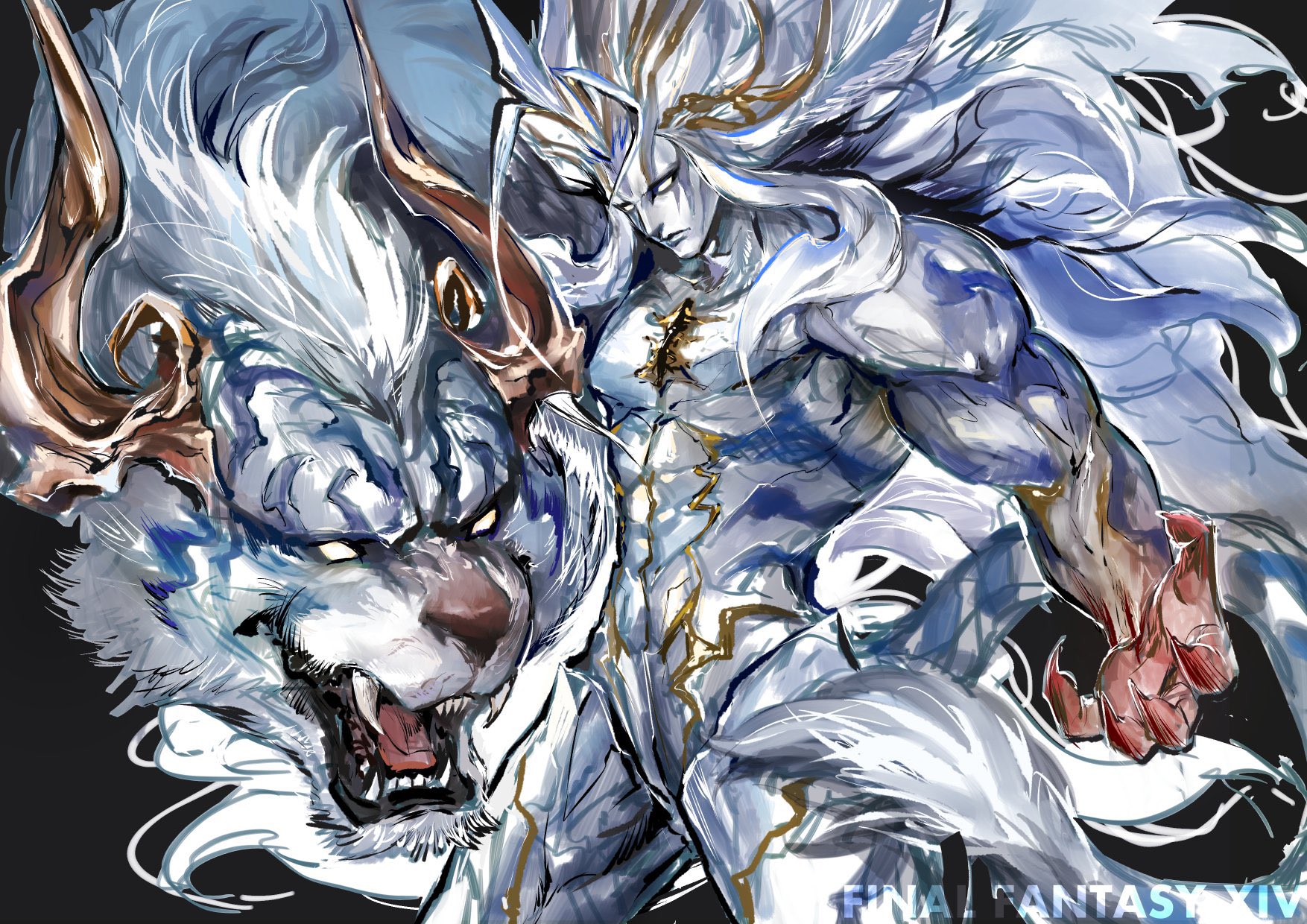 1boy black_background blank_eyes blue_skin byakko_(ff14) claws colored_skin copyright_name dual_persona fangs final_fantasy final_fantasy_xiv highres horns kurogorororo long_hair male_focus monster_boy multicolored_skin muscular muscular_male open_mouth simple_background standing tail tiger tiger_boy tiger_tail topless_male white_hair white_skin white_tiger