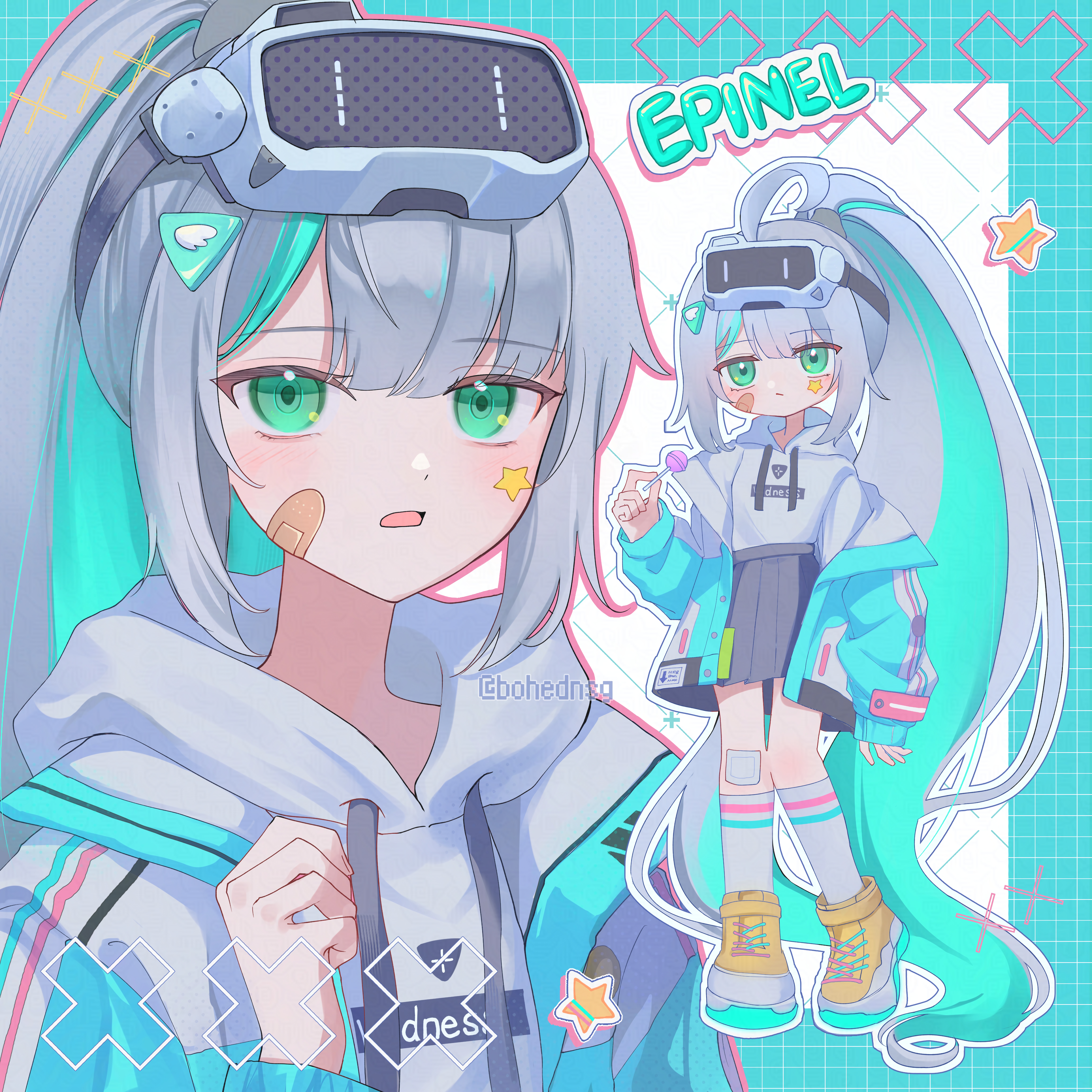 1girl absurdres bandaid bandaid_on_face bare_shoulders blush breasts candy chikyuu_(bohednsg) cleavage dual_persona epinel_(nikke) food full_body gloves goddess_of_victory:_nikke hair_between_eyes hair_ornament highres jacket large_breasts lollipop long_hair long_sleeves looking_at_viewer navel open_mouth shirt solo thighs