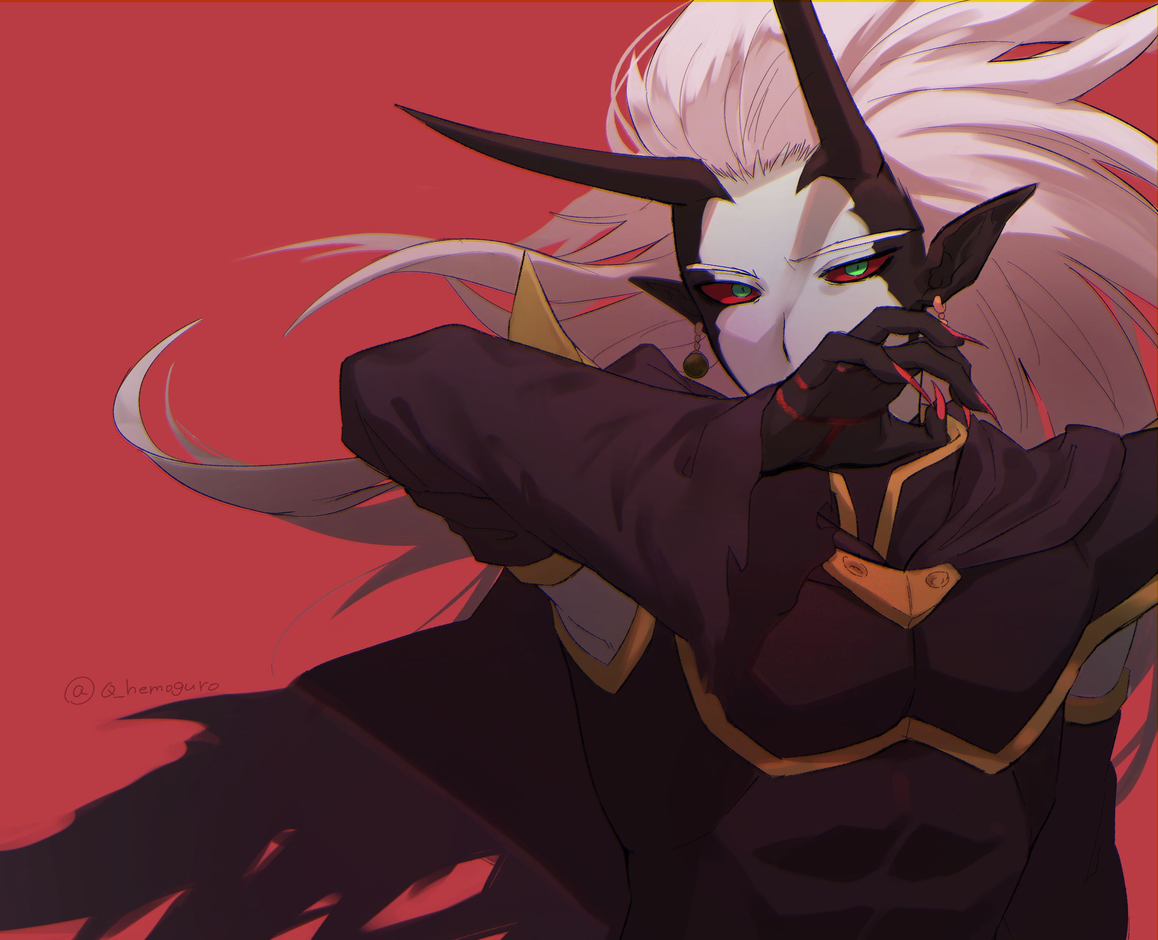 1boy arm_up armor black_armor black_cape black_skin blue_skin cape colored_sclera colored_skin commentary_request covered_mouth demon_boy detached_sleeves dragon_ball dragon_ball_heroes earrings fingernails floating_cape floating_hair green_eyes highres horns jewelry long_hair looking_at_viewer male_focus mechikabura moguro_(qianchul) multicolored_skin pointy_ears potara_earrings red_background red_nails red_sclera sharp_fingernails solo torn_cape torn_clothes twitter_username two-tone_skin upper_body white_hair