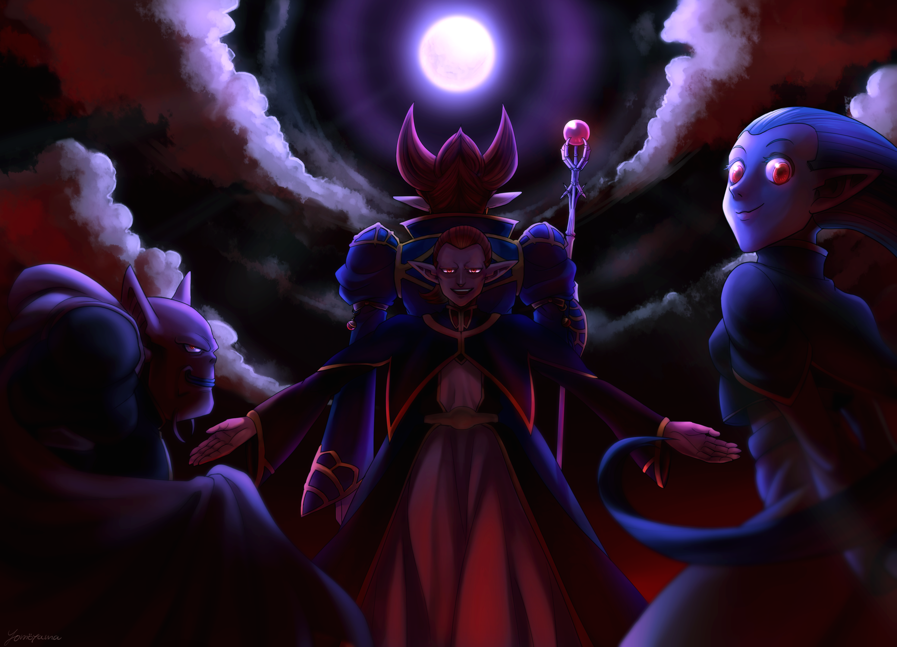 1girl 3boys aqua_hair armlet arms_behind_back bald blue_lips cape cloud colored_skin commentary_request demigra demon_boy demon_girl dragon_ball dragon_ball_heroes dual_persona floating_hair full_moon glowing glowing_eyes gravy_(dragon_ball) hair_slicked_back highres jewelry long_hair long_sleeves looking_at_viewer looking_back mage_staff moon multiple_boys night no_eyebrows open_mouth outstretched_arms pointy_ears puffy_long_sleeves puffy_sleeves purple_skin putine_(dragon_ball) red_eyes red_hair red_skin robe rogues'_gallery sky smile staff teeth wizard yomogi_banashi