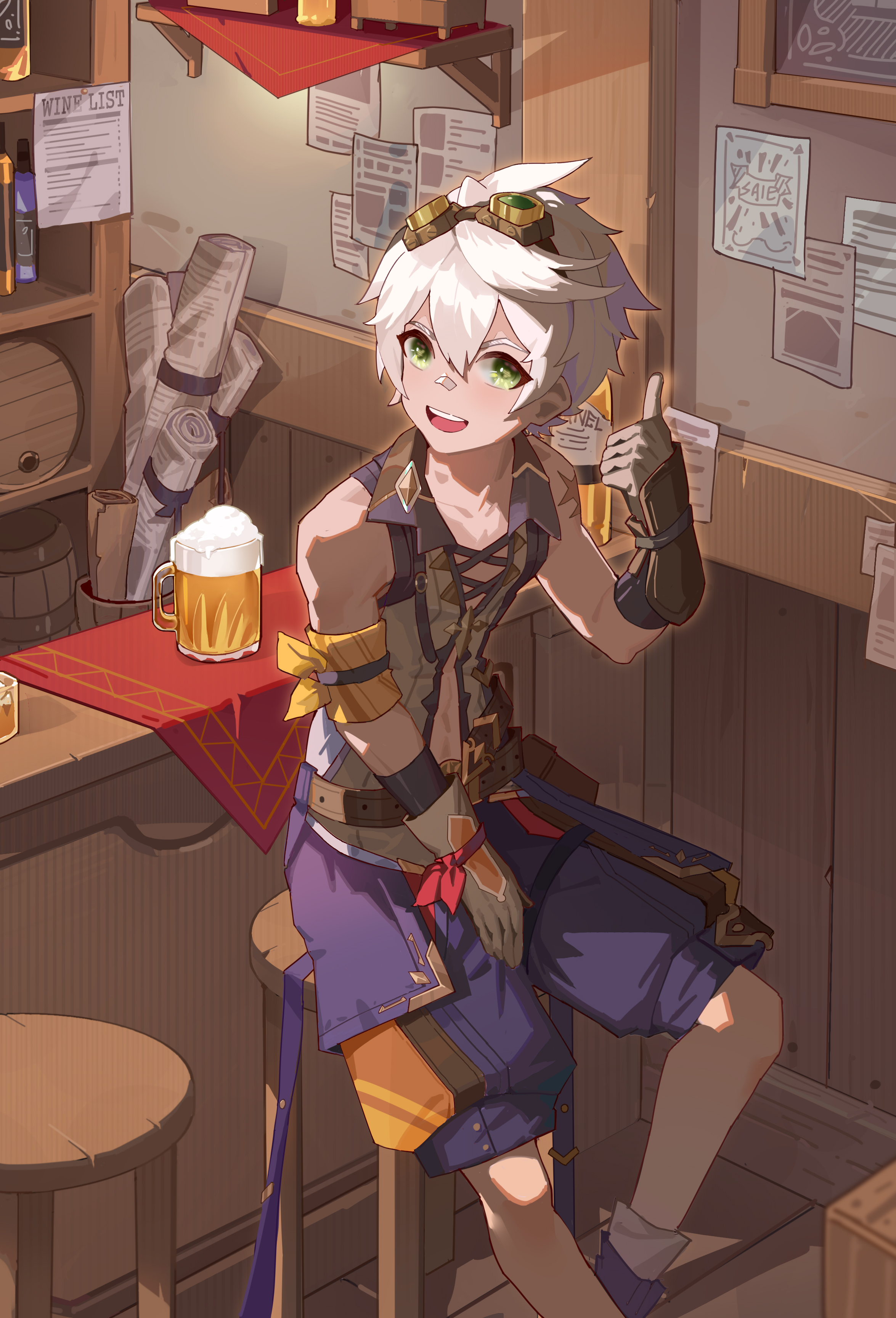 1boy absurdres alan_lan_lan alcohol bandaid bandaid_on_face bandaid_on_nose bar_(place) beer beer_mug bennett_(genshin_impact) cup genshin_impact gloves goggles goggles_on_head green_eyes hair_between_eyes highres indoors male_focus mug open_mouth paper scar shadow short_hair shorts sitting sleeveless smile solo teeth thumbs_up upper_teeth_only white_hair