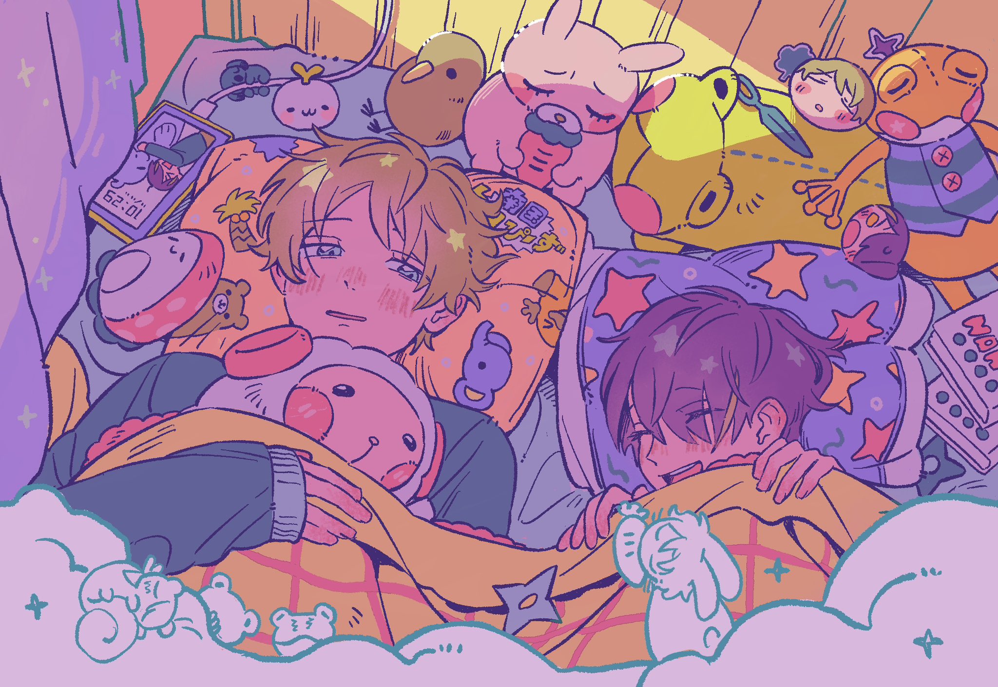 2boys alternate_costume bedroom bird blush book border cable cellphone character_doll covered_mouth curtains day doll doodle_inset ensemble_stars! eyes_visible_through_hair from_above furrowed_brow gyu_me327 hair_over_one_eye half-closed_eyes hands_up happy highres hugging_object implied_yaoi indoors kiwi_(bird) kunai long_sleeves looking_at_another male_focus multiple_boys nostrils on_bed open_mouth pajamas parted_lips phone pillow sengoku_shinobu shared_blanket shuriken side-by-side sleepover sleeves_past_wrists smartphone star_(symbol) stuffed_animal stuffed_bird stuffed_frog stuffed_rabbit stuffed_sheep stuffed_strawberry stuffed_toy takamine_midori teeth under_covers upper_teeth_only weapon