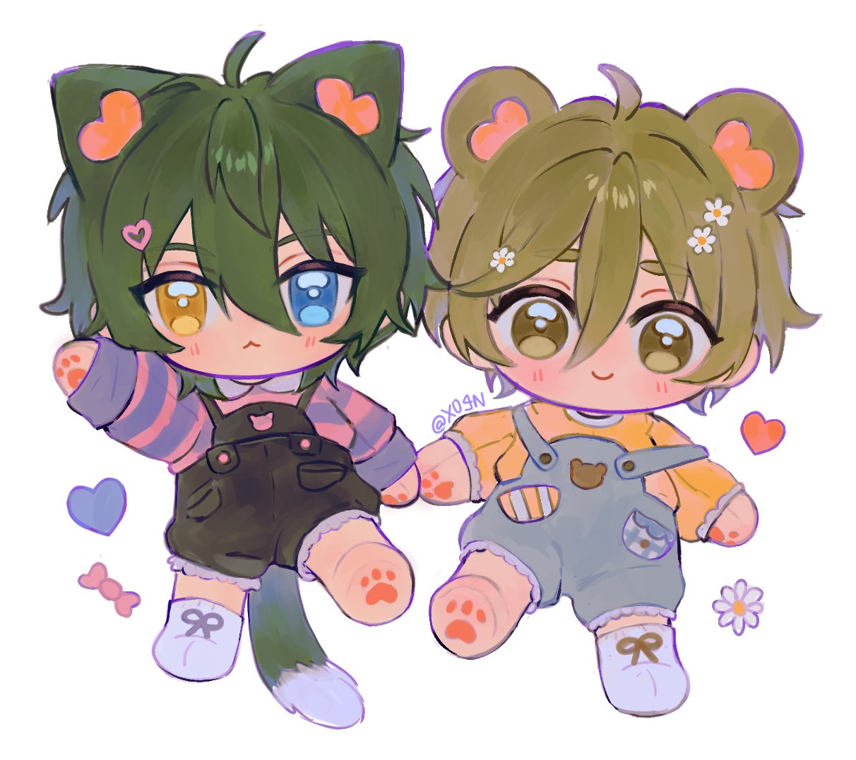2boys :3 alternate_costume animal_ears bear_ears candy cat_ears cat_tail character_doll chibi chibi_only doll doodle_inset ensemble_stars! facing_viewer flower flower_symbol food full_body hair_flower hair_ornament heart heart_hair_ornament holding_hands kagehira_mika kemonomimi_mode light_blush male_focus mashiro_tomoya multiple_boys no_nose no_pupils objectification overalls pawpads side-by-side signature simple_background single_sock smile socks standing standing_on_one_leg straight-on strap_slip striped_clothes striped_sweater stuffed_toy sweater tail waving white_socks wrapped_candy x0_4n