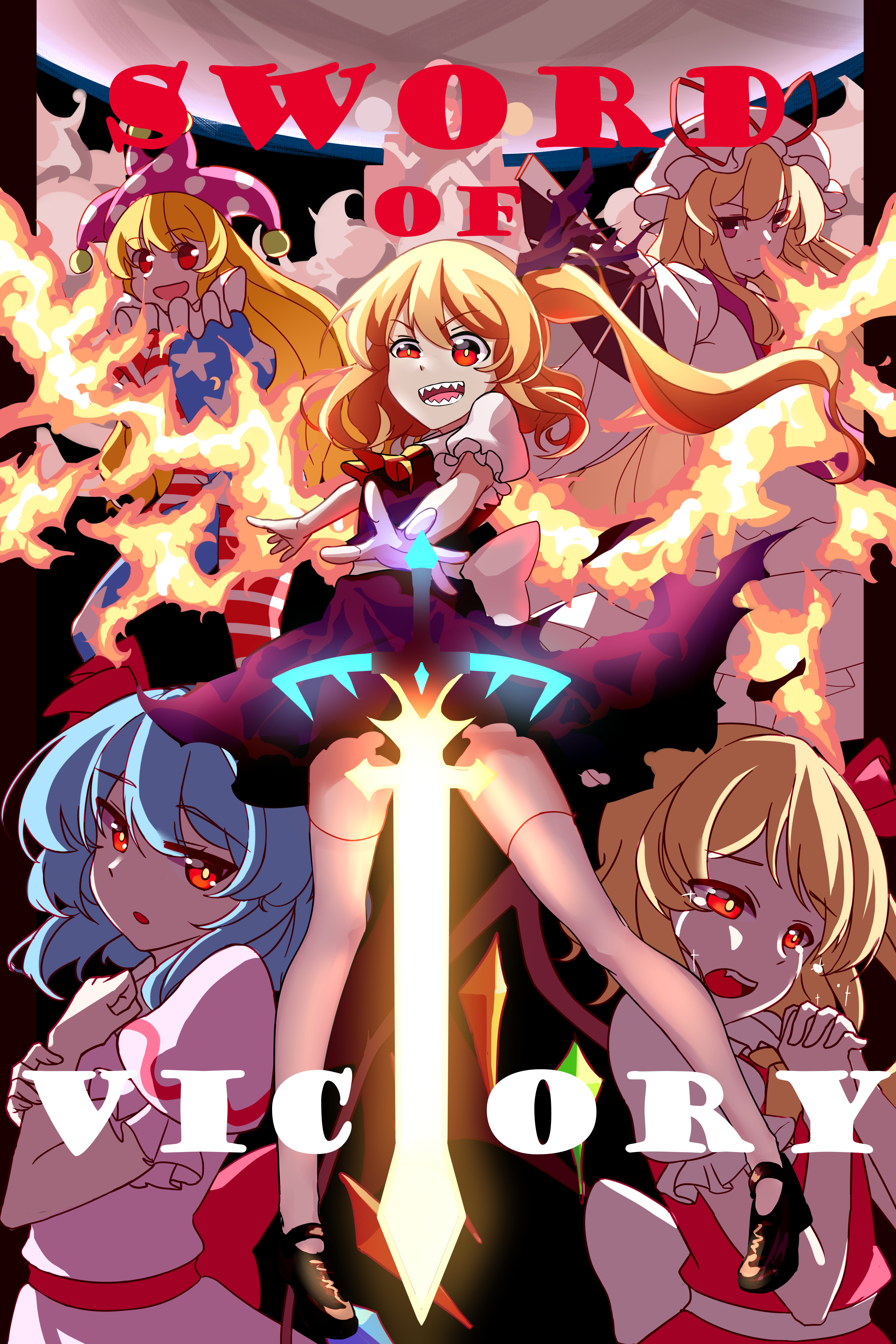 5girls absurdres american_flag american_flag_print ascot asymmetrical_legwear asymmetrical_sleeves back_bow black_background black_footwear blonde_hair blue_dress blue_hair blue_pantyhose bow bright_pupils chinese_commentary clenched_hand clone clownpiece commentary_request crazy crazy_eyes crazy_smile crying crying_with_eyes_open crystal_wings dress english_text fiery_wings flag_print flandre_scarlet floating_clothes floating_hair folding_fan frilled_headwear frilled_sleeves frills hair_ribbon hand_fan hand_on_own_chest hat hat_ribbon hentai-faith high_heels highres holding holding_fan holding_own_wrist interlocked_fingers jester_cap knees long_dress long_hair long_sleeves looking_at_viewer medium_hair miniskirt mismatched_legwear mismatched_sleeves mob_cap multicolored_dress multiple_girls neck_ruff missing_headwear open_mouth outstretched_arm own_hands_clasped own_hands_together pantyhose pink_shirt pink_skirt polka_dot_headwear pom_pom_hat_ornament poster_(medium) puffy_short_sleeves puffy_sleeves purple_hat purple_ribbon purple_skirt purple_tabard purple_vest red_bow red_dress red_eyes red_pantyhose red_ribbon red_skirt red_vest remilia_scarlet ribbon sharp_teeth shirt short_sleeves siblings side_ponytail sisters skirt skirt_set smile star_(symbol) star_print striped_clothes striped_dress striped_pantyhose sword tabard teardrop tears teeth thighhighs torn_clothes torn_ribbon torn_skirt touhou two-tone_pantyhose vest weapon white_bow white_dress white_hat white_pantyhose white_pupils white_shirt white_thighhighs wings yakumo_yukari yellow_ascot