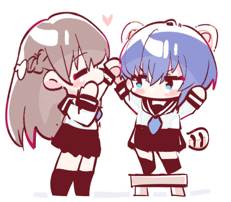 2girls =_= animal_ears arms_up black_sailor_collar blue_eyes blue_hair blue_neckerchief blush braid brown_hair chibi chibi_only commentary half_up_braid heart height_difference kemonomimi_mode long_hair long_sleeves multiple_girls na_nare_hana_nare neckerchief obunai_suzuha sailor_collar school_uniform serafuku shirt short_hair tanizaki_shion white_shirt zhanzhangzlw