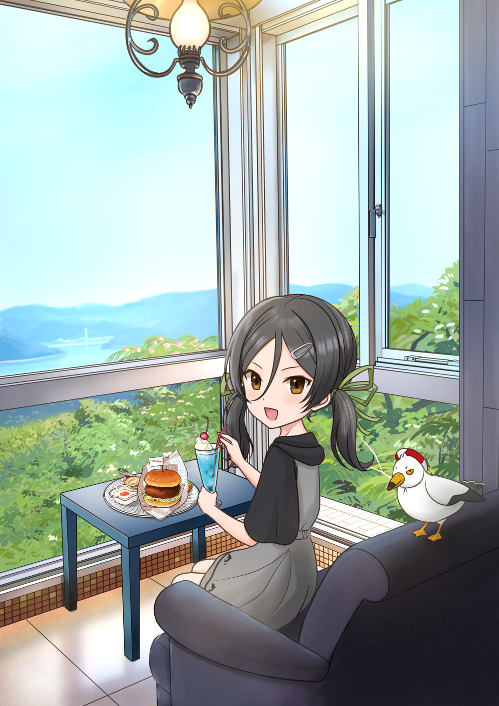 1girl bird black_hair brown_eyes burger commentary_request couch dress drink food from_behind grey_dress hair_between_eyes hair_ornament hairclip highres hitakikan hooded_dress inagi_(kancolle) inagi_(maizuru)_(kancolle) kantai_collection looking_at_viewer looking_back low_twintails official_alternate_costume scenery seagull smile twintails