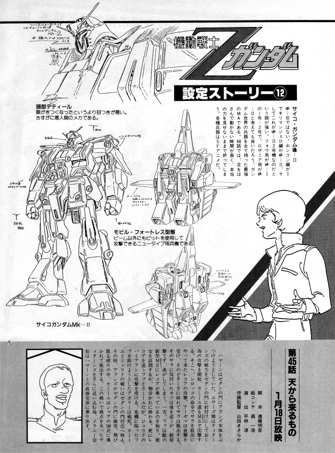 2boys animec_(magazine) apolly_bay artist_request greyscale grin gundam highres ink_(medium) kamille_bidan lineart logo magazine_scan mecha military_uniform mobile_armor monochrome multiple_boys multiple_views production_art psycho_gundam_mk_ii robot scan smile title traditional_media transformation zeta_gundam
