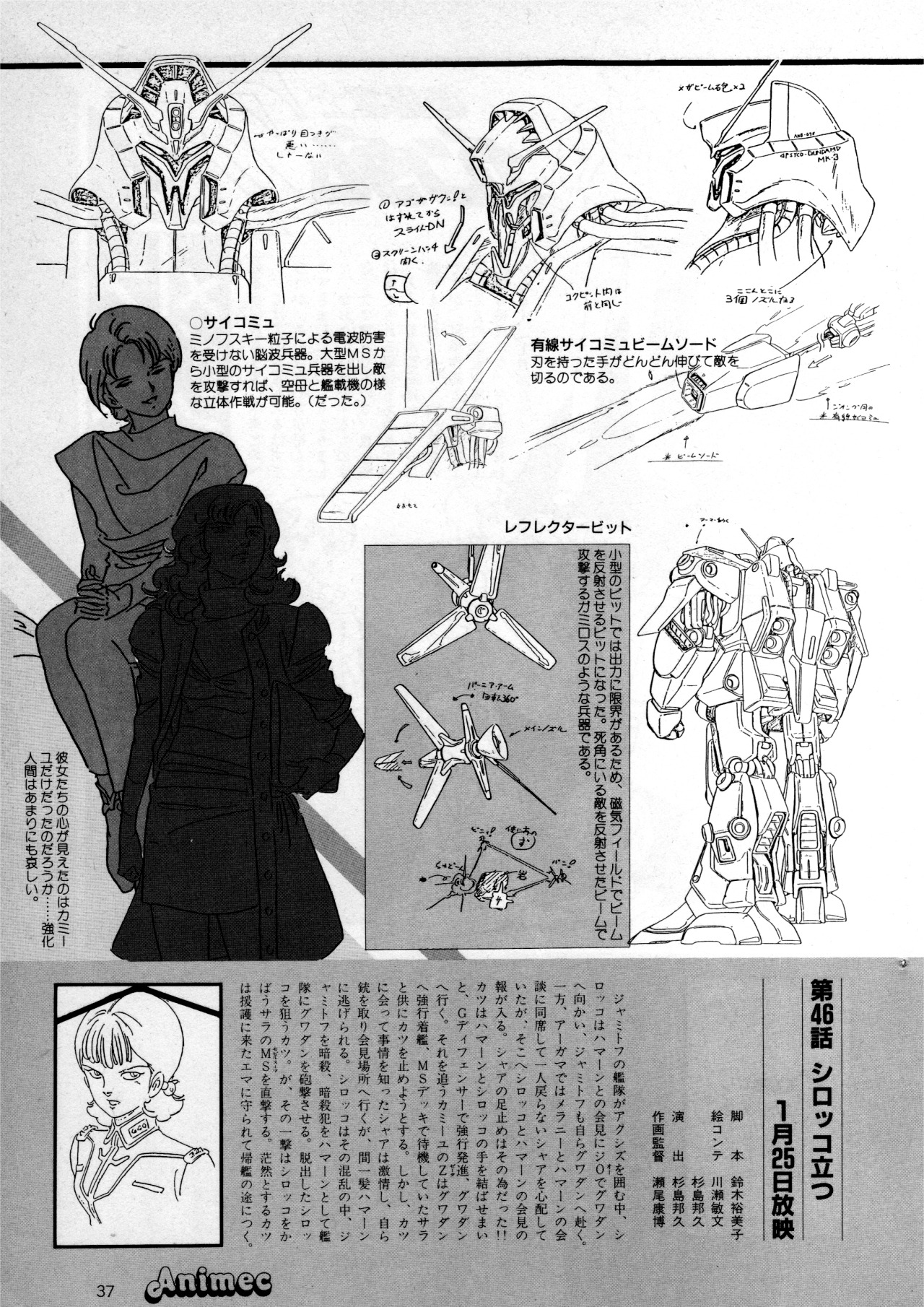 1980s_(style) 3girls animec_(magazine) artist_request commentary english_commentary four_murasame greyscale gundam gundam_zz highres lineart machinery magazine_scan mecha mobile_suit monochrome multiple_girls multiple_views official_art oldschool production_art promotional_art psycho_gundam_mk_ii retro_artstyle robot rosamia_badam sarah_zabiarov scan science_fiction titans_(gundam) translation_request upper_body zeta_gundam