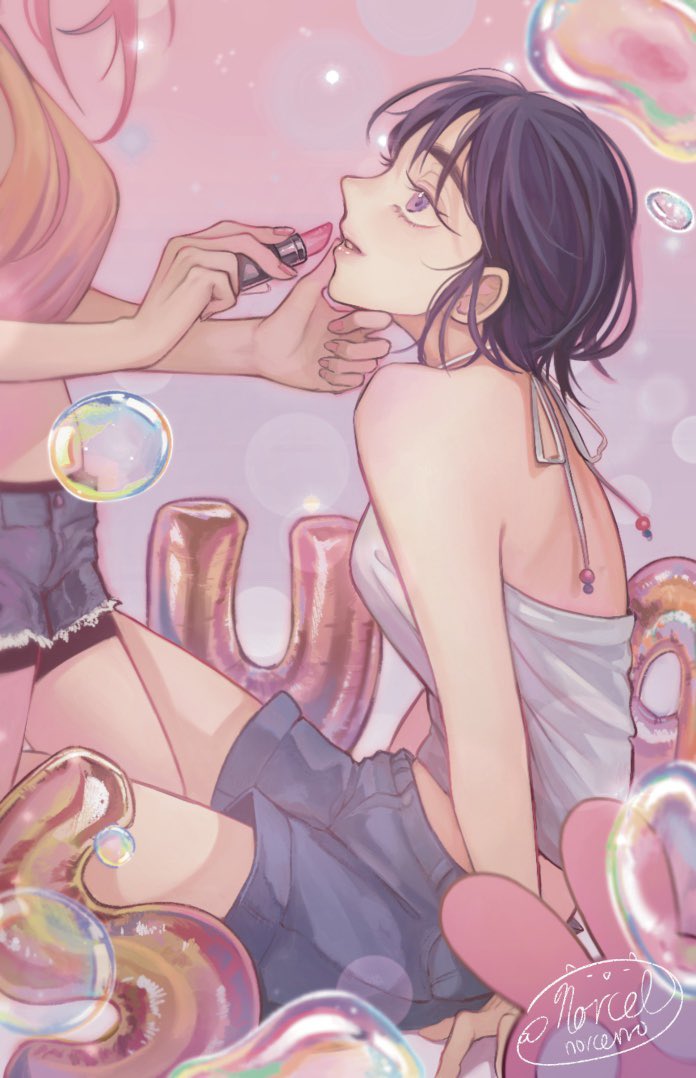 2girls alien_stage applying_lipstick applying_makeup balloon bare_arms between_legs blue_shorts bubble commentary cosmetics denim denim_shorts hand_on_another's_cheek hand_on_another's_face holding holding_lipstick_tube lipstick_tube looking_at_another mizi_(alien_stage) multiple_girls norcerro orange_shirt parted_lips pink_hair purple_background purple_eyes purple_hair shirt short_hair shorts signature sitting sleeveless sleeveless_shirt sua_(alien_stage) white_shirt yuri