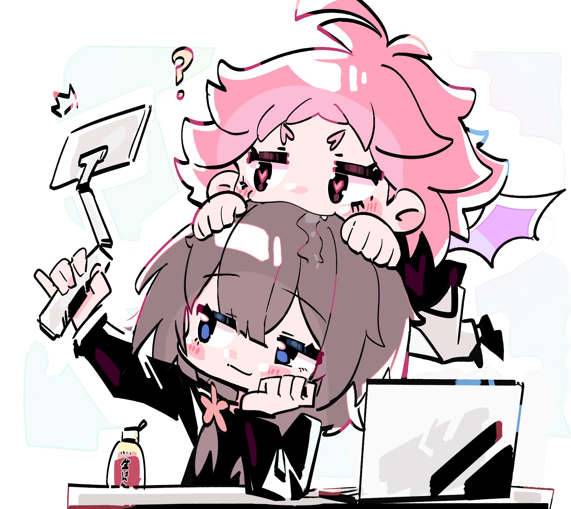 2girls ? ^^^ antenna_hair bat_wings head_biting black_hair blue_eyes blush_stickers cellphone commentary_request computer fang flower flying hair_flower hair_ornament hand_on_own_cheek hand_on_own_face hands_on_another's_head heart heart-shaped_pupils highres holding holding_stick jitome laptop live_(mayonaka_punch) low_twintails masaki_(mayonaka_punch) mayonaka_punch multiple_girls phone pink_eyes pink_hair selfie_stick smartphone smile spiked_hair stick symbol-shaped_pupils twintails vampire wings yuri zhanzhangzlw