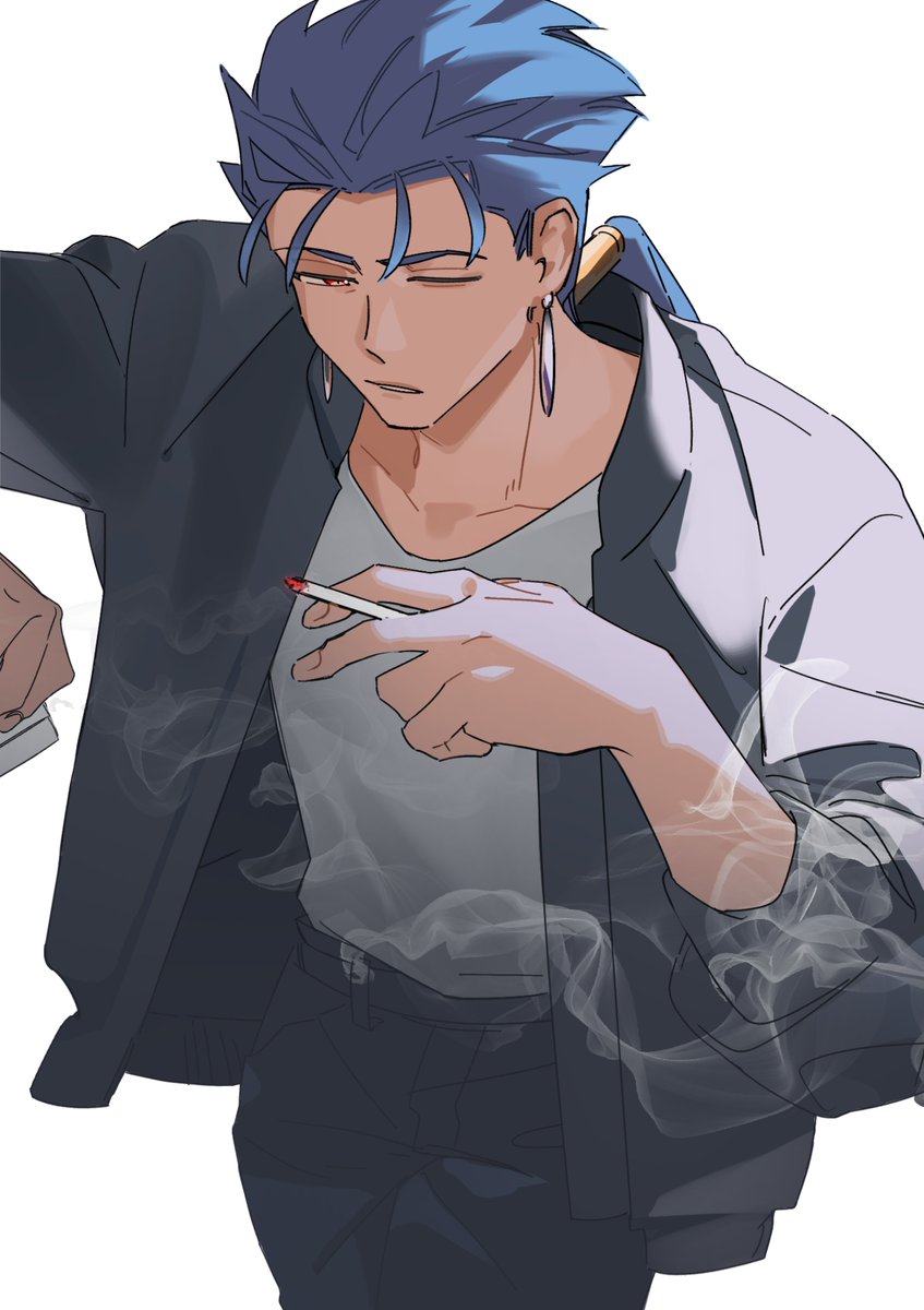 1boy belt black_belt black_jacket black_pants blue_hair cigarette commentary cowboy_shot cropped_arm cu_chulainn_(casual_wear)_(fate) cu_chulainn_(fate) cu_chulainn_(lancer)_(fate) ear_piercing earrings fate/stay_night fate_(series) hand_up highres holding holding_cigarette jacket jewelry long_hair looking_at_viewer low_ponytail male_focus one_eye_closed pants parted_lips piercing ponytail red_eyes shirt simple_background smoke smoke_trail smoking solo straight-on undershirt wagaya43 white_background white_shirt