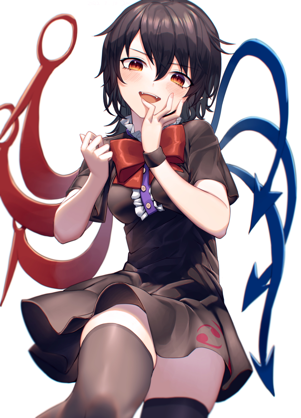 1girl asymmetrical_wings black_dress black_hair black_skirt black_thighhighs blue_wings blush bow bowtie breasts buttons center_frills dress fingernails frills hair_between_eyes hand_on_own_face hands_up happy highres houjuu_nue kisamu_(ksmz) looking_at_viewer medium_breasts open_mouth pointy_ears red_bow red_bowtie red_eyes red_wings short_hair short_sleeves simple_background skirt smile solo teeth thighhighs thighs tomoe_(symbol) touhou white_background wings wristband zettai_ryouiki