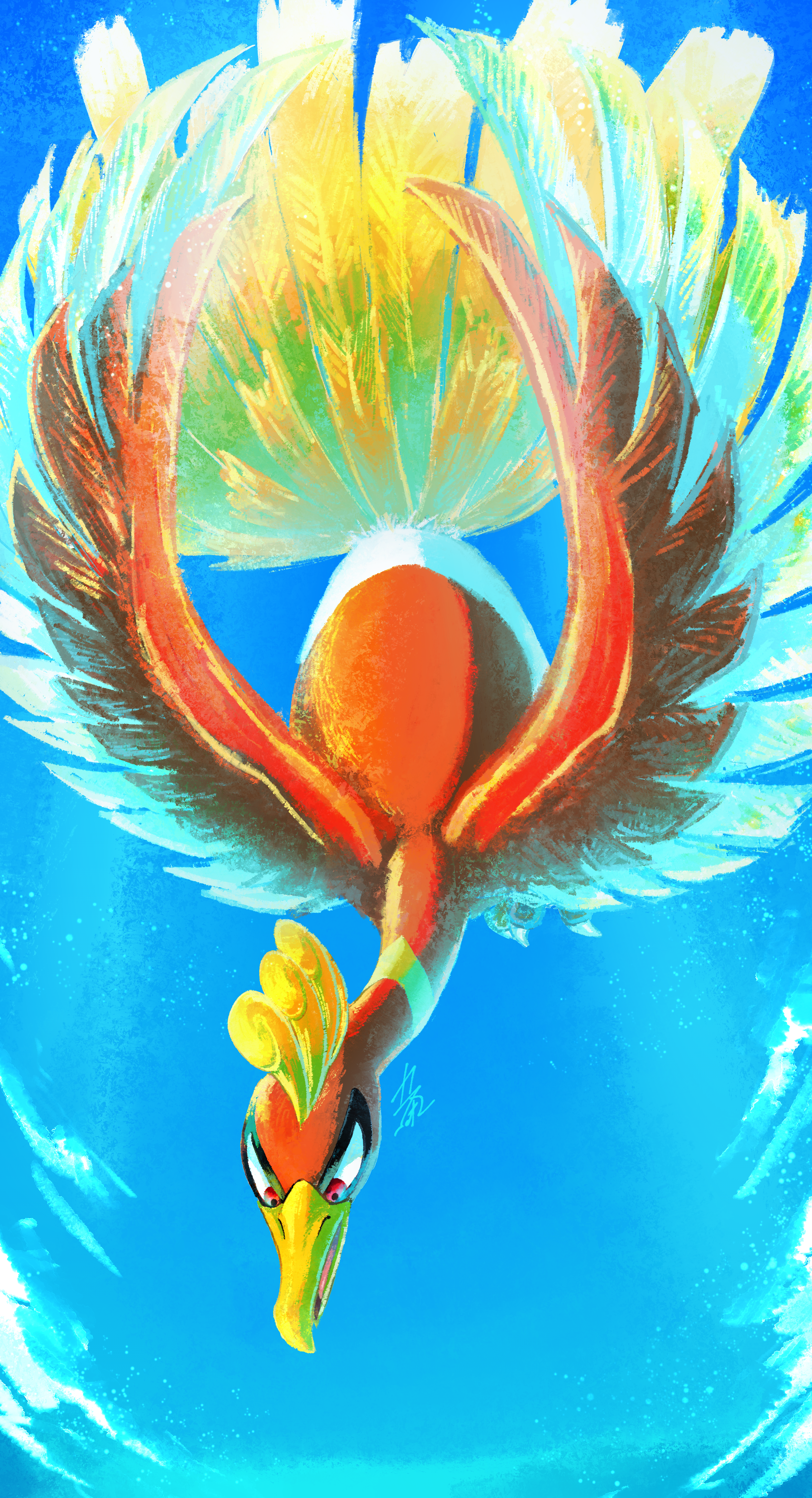 absurdres animal_focus bird commentary_request day gen_2_pokemon highres ho-oh kaneoto_(mayukan) legendary_pokemon nintendo no_humans open_mouth outdoors pokemon pokemon_(creature) red_eyes signature sky solo