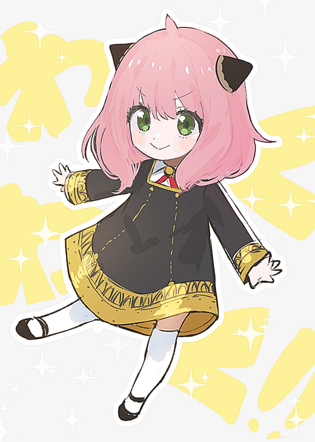 1girl :> anya_(spy_x_family) black_dress black_shoes closed_mouth dress eden_academy_school_uniform full_body gold_trim green_eyes hairpods long_hair long_sleeves looking_at_viewer mechiru necktie pink_hair red_necktie school_uniform shoes smile socks solo spy_x_family white_socks