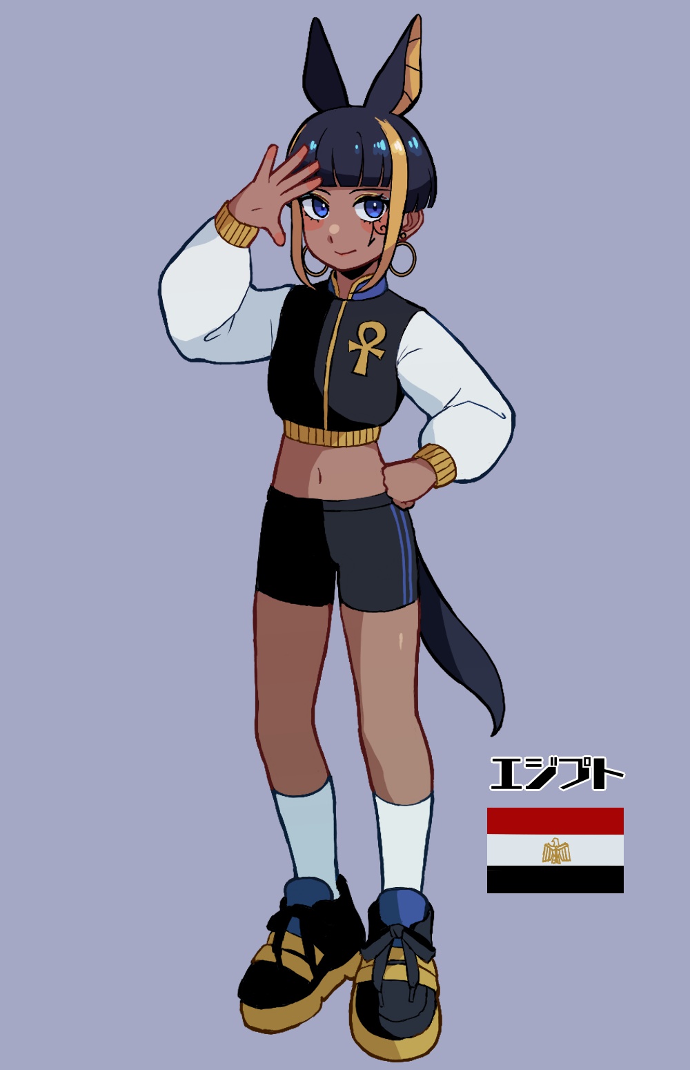 1girl animal_ears ankh_print bike_shorts blue_eyes blush_stickers dark-skinned_female dark_skin earrings egypt egypt_(kuroussa) egyptian_flag facial_tattoo full_body hand_on_own_hip high_collar highres hoop_earrings jacket jewelry kuroussa light_smile midriff multicolored_hair original personification short_hair socks solo spread_fingers standing tail tattoo track_jacket two-tone_hair white_socks
