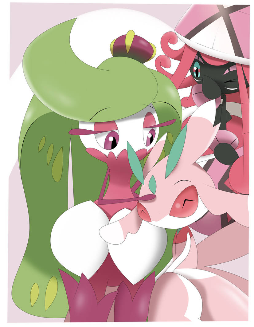 ashihyper blue_eyes closed_eyes crown gen_7_pokemon green_hair legendary_pokemon long_hair lurantis monster_girl nintendo one_eye_closed pink_eyes plant_girl pokemon pokemon_(creature) standing tapu_lele tsareena wink