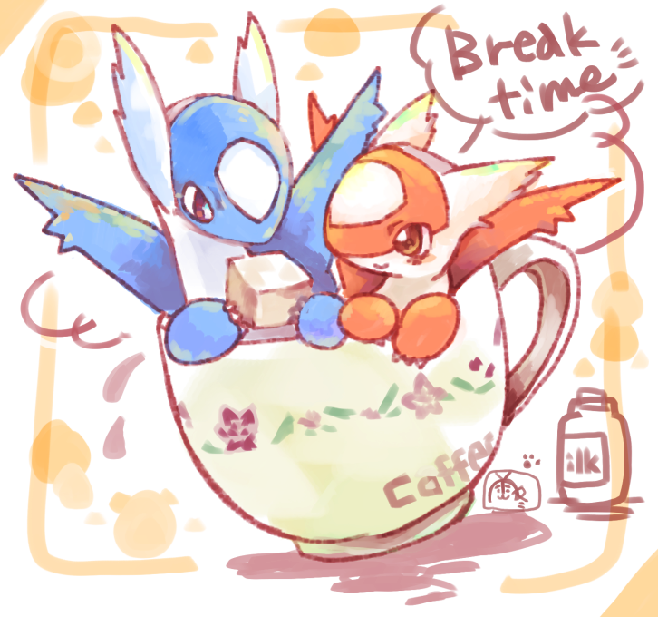 blush bottle claws cup gen_3_pokemon holding latias latios legendary_pokemon milk mug nintendo pokemon pokemon_(creature) red_eyes roamo smile wings yellow_eyes