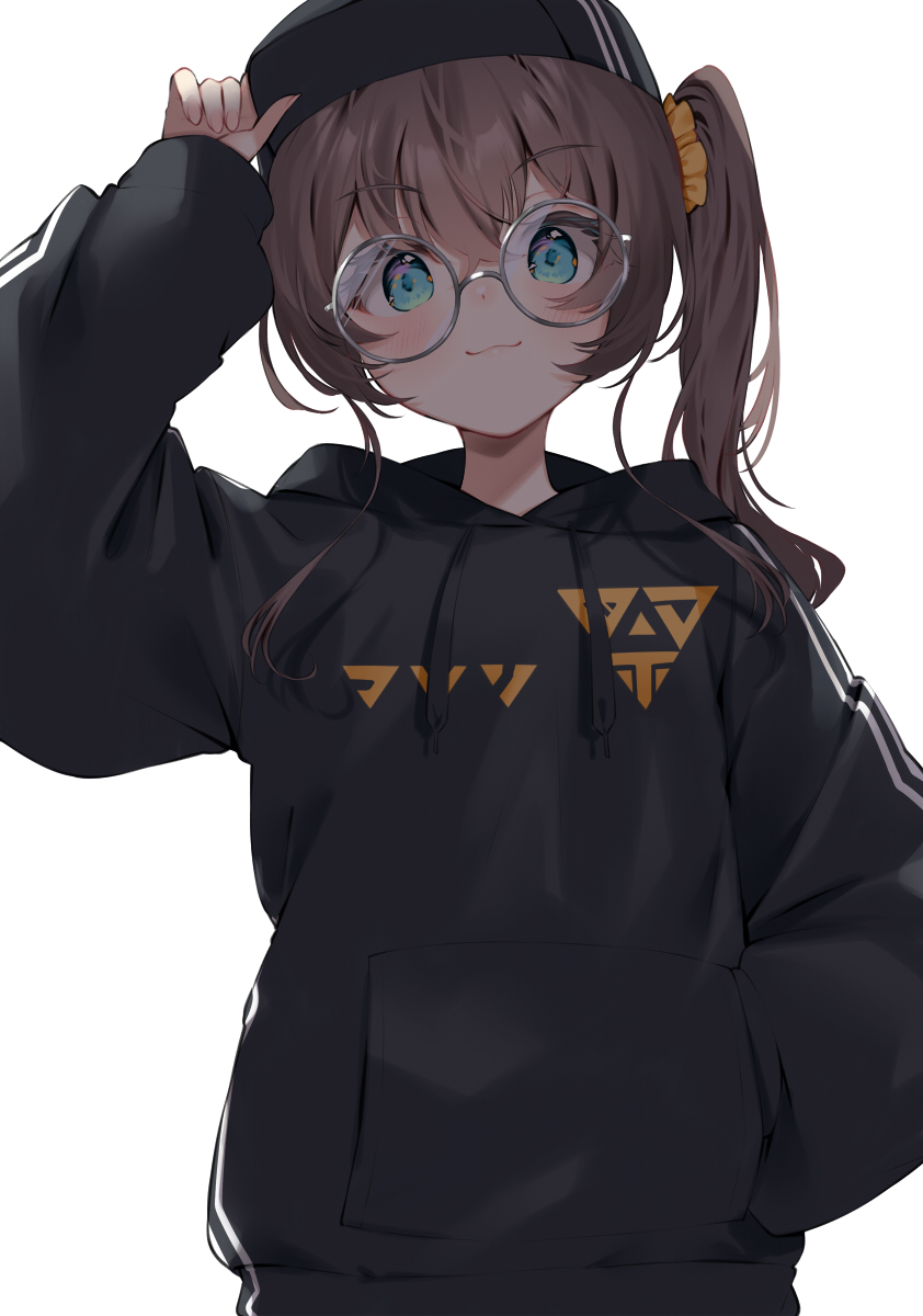 1girl :3 baseball_cap black_hat black_hoodie blue_eyes brown_hair erubusubori glasses hand_in_pocket hand_on_headwear hat highres hololive hood hoodie long_hair long_sleeves looking_at_viewer natsuiro_matsuri round_eyewear side_ponytail simple_background solo triforce_print virtual_youtuber white_background