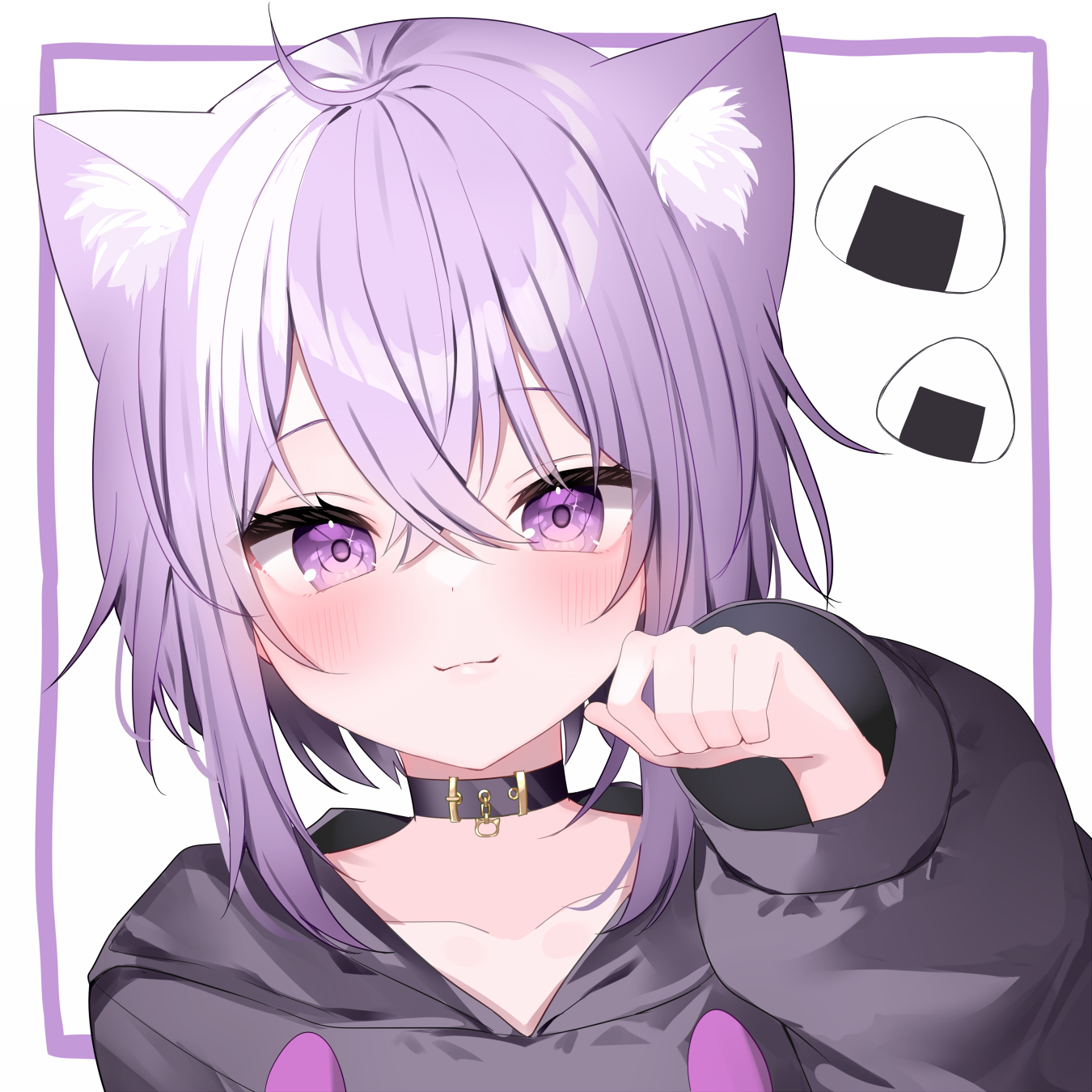 1girl ahoge animal_ear_fluff animal_ears black_collar black_hoodie blush cat_ears cat_girl collar food highres hololive hood hoodie looking_at_viewer maruru_(marurupan) medium_hair nekomata_okayu nekomata_okayu_(1st_costume) onigiri paw_pose purple_eyes purple_hair smile solo virtual_youtuber white_background