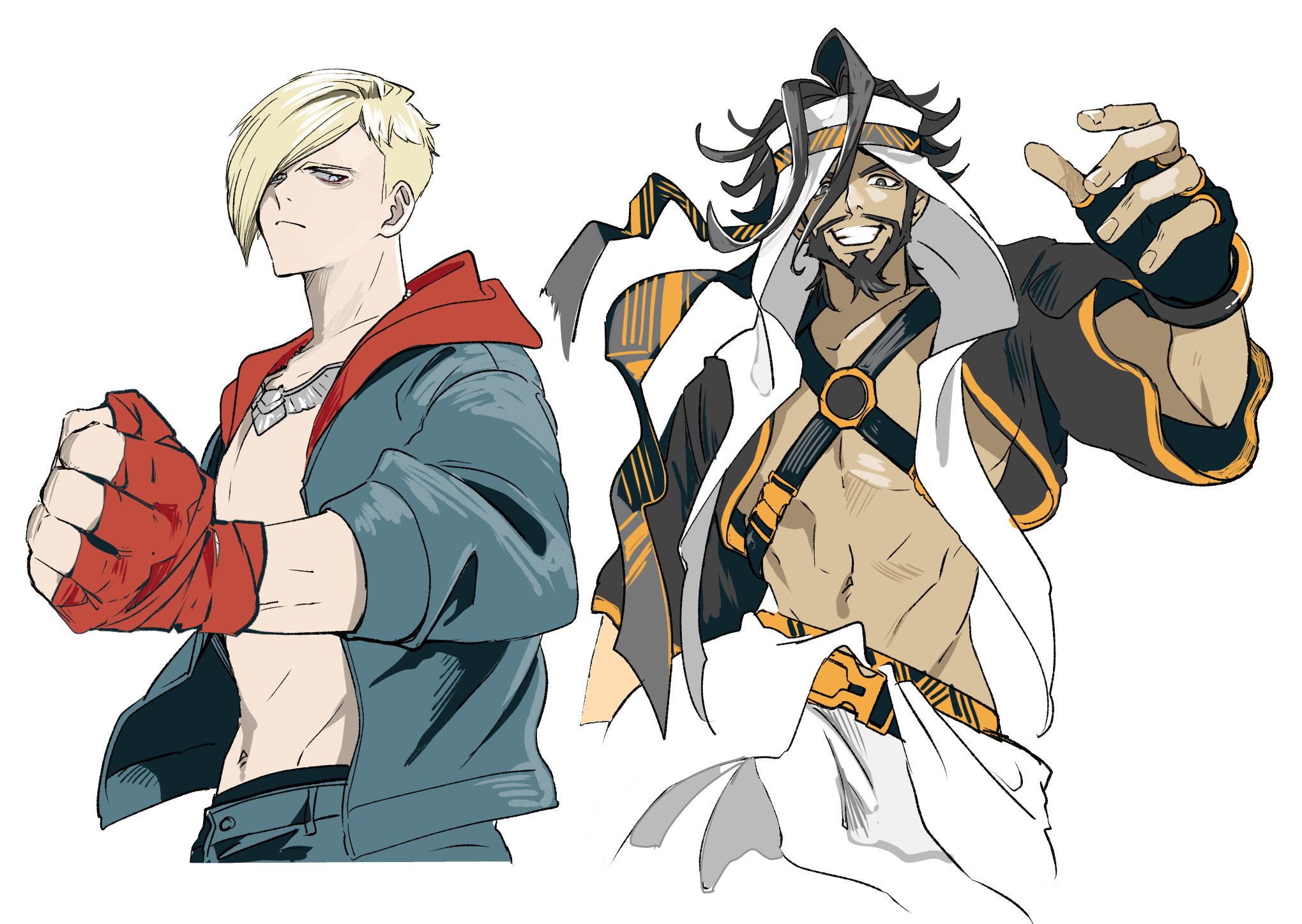 2boys abs asymmetrical_hair baggy_clothes beard belt black_hair black_jacket blonde_hair blue_eyes blue_hoodie brown_eyes clenched_hand closed_mouth commentary cowboy_shot dark-skinned_male dark_skin denim ed_(street_fighter) facial_hair gloves grin groin hair_intakes hand_up hand_wraps headband highres hood hoodie jacket jeans jewelry light_frown male_focus multicolored_jacket multiple_boys necklace open_clothes open_jacket pants pectorals rashid_(street_fighter) red_gloves red_hood simple_background smile spiked_hair street_fighter street_fighter_6 untranslatable_commentary turban white_background white_pants yuz46