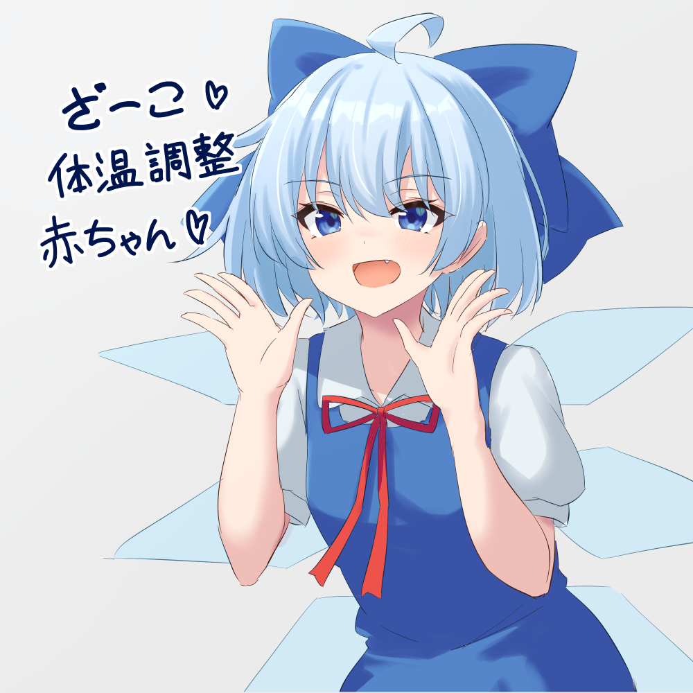 1girl ahoge blue_eyes blue_hair bow cirno commentary_request dress fang hair_bow hands_up neck_ribbon open_mouth pinafore_dress remiria100 ribbon short_hair short_sleeves sleeveless sleeveless_dress smile solo touhou translation_request wings