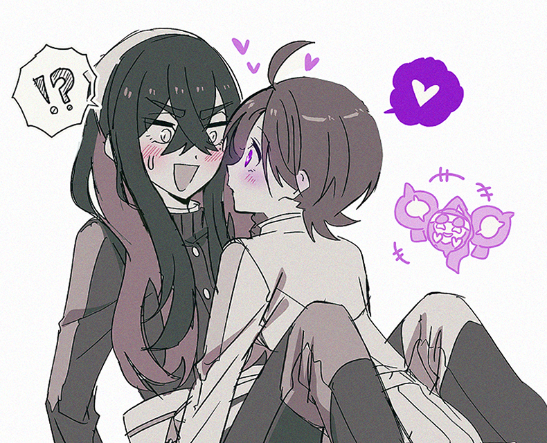 !? 2girls between_legs black_hair black_shirt blush brown_hair carmine_(pokemon) commentary_request eye_contact heart heart-shaped_pupils hyaku_ae_mon juliana_(pokemon) long_hair long_sleeves looking_at_another mind_control multicolored_hair multiple_girls nintendo open_mouth pecharunt pokemon pokemon_scarlet_and_violet possessed possession purple_eyes red_hair shirt short_hair simple_background spoken_interrobang streaked_hair sweatdrop symbol-shaped_pupils white_background white_shirt yuri