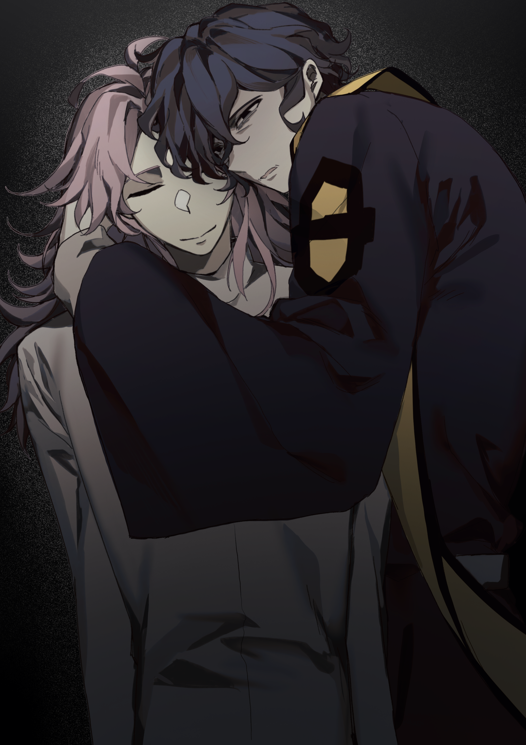 2boys absurdres black_coat black_eyes blue_hair chinese_commentary chunaizhanshi23057 closed_eyes closed_mouth coat commentary_request dark_blue_hair hatsutori_hajime highres long_hair long_sleeves male_focus multiple_boys open_mouth pink_hair saibou_shinkyoku shirt short_hair smile upper_body utsugi_noriyuki white_shirt wide_sleeves