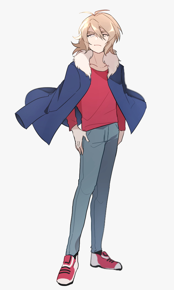 1boy antenna_hair arudente_(einisikawaiiyo) blue_jacket blue_pants closed_mouth collarbone commentary_request full_body fur-trimmed_jacket fur_trim hair_between_eyes hands_on_own_hips isoi_reiji jacket jacket_on_shoulders light_brown_hair long_sleeves male_focus medium_hair pants red_shirt red_shoes saibou_shinkyoku sanpaku shirt shoes simple_background solo white_background