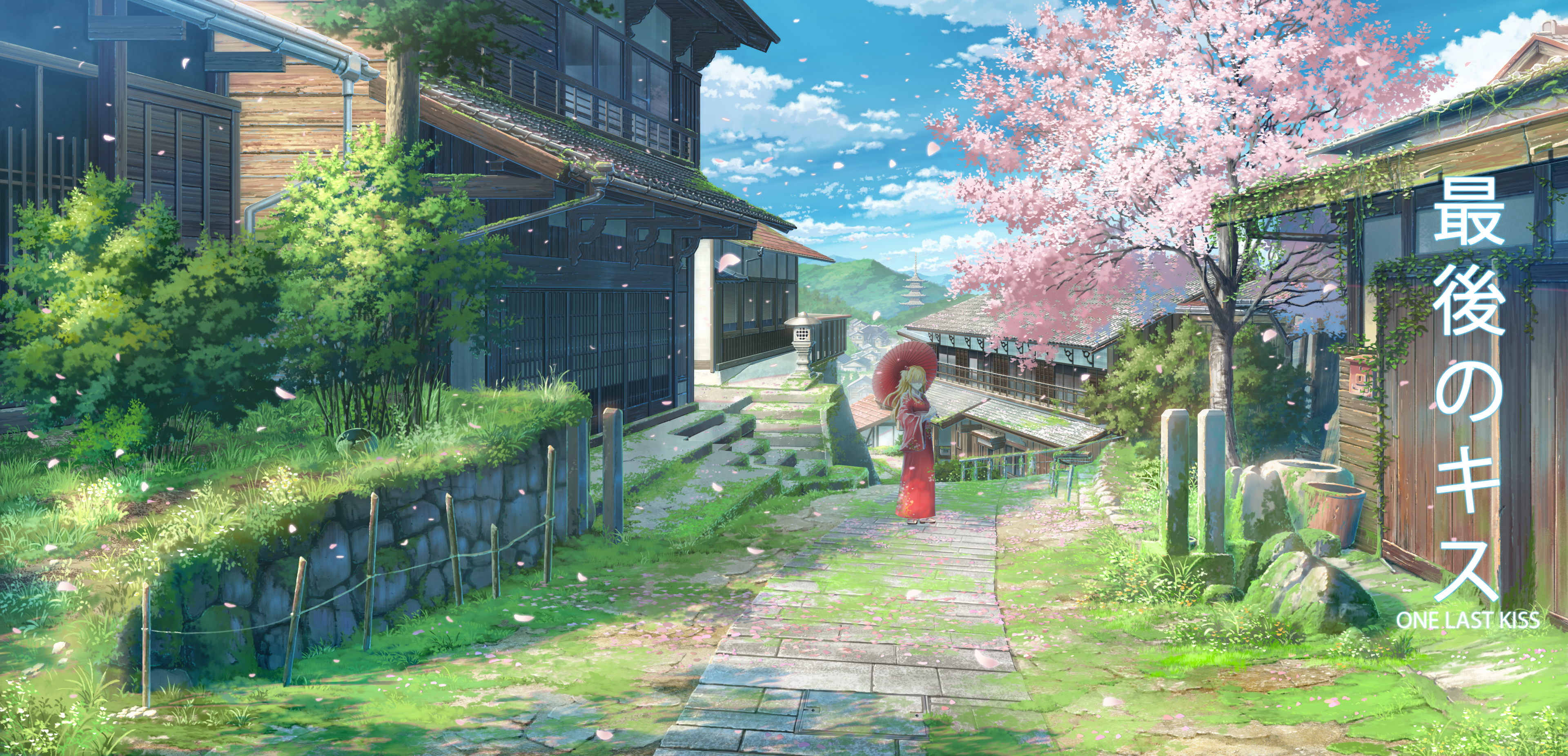 1girl absurdres blonde_hair blue_sky building bush check_commentary cherry_blossoms cherry_tree cloud commentary_request day fantasy grass hair_over_eyes highres holding holding_umbrella house japanese_clothes kimono miko mountain mountainous_horizon nature oil-paper_umbrella original outdoors pagoda red_kimono road scenery sky standing stone_walkway street umbrella vanishing_point wide_sleeves window yosanann