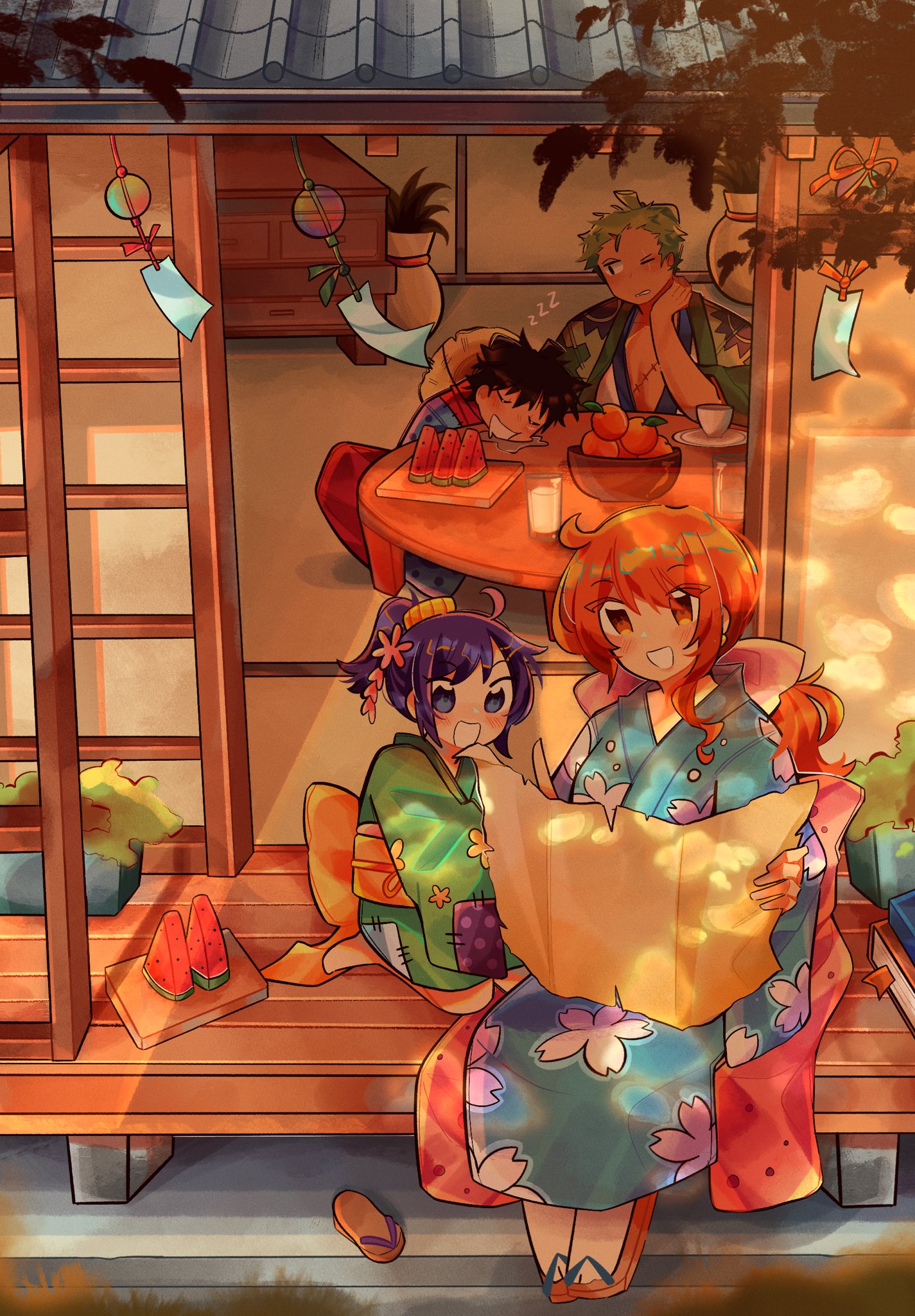 2boys 2girls architecture black_hair blue_eyes blue_kimono blush child commentary cup dappled_sunlight east_asian_architecture eggtuna english_commentary floral_print floral_print_kimono food from_outside fruit full_body green_hair green_kimono hair_ornament hair_ribbon hat highres holding holding_map japanese_clothes kimono kurozumi_tama long_hair long_sleeves low_ponytail mandarin_orange map milk monkey_d._luffy multiple_boys multiple_girls nami_(one_piece) nami_(one_piece)_(wano) obi one_eye_closed one_piece open_mouth orange_eyes orange_hair ponytail print_kimono purple_hair red_kimono ribbon roronoa_zoro sandals sash scar scar_on_chest seiza short_hair single_sidelock sitting sleeping smile straw_hat sunlight unworn_hat unworn_headwear watermelon watermelon_slice wide_sleeves wind_chime zzz