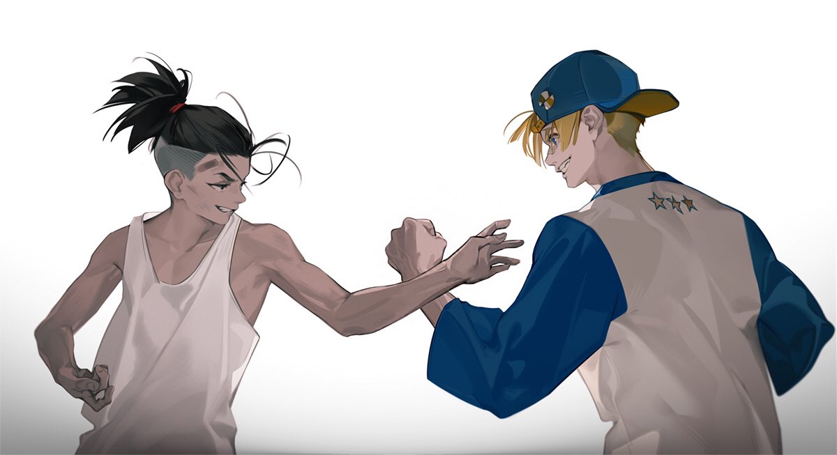 2boys aged_down backwards_hat baseball_cap black_hair blonde_hair blue_eyes child clenched_hand commentary dark-skinned_male dark_skin english_commentary fighting_stance grin hands_up hat jamie_siu looking_at_another luke_sullivan multicolored_clothes multiple_boys ponytail profile shirt short_ponytail simple_background smile street_fighter street_fighter_6 tank_top teeth upper_body wanli white_background white_tank_top