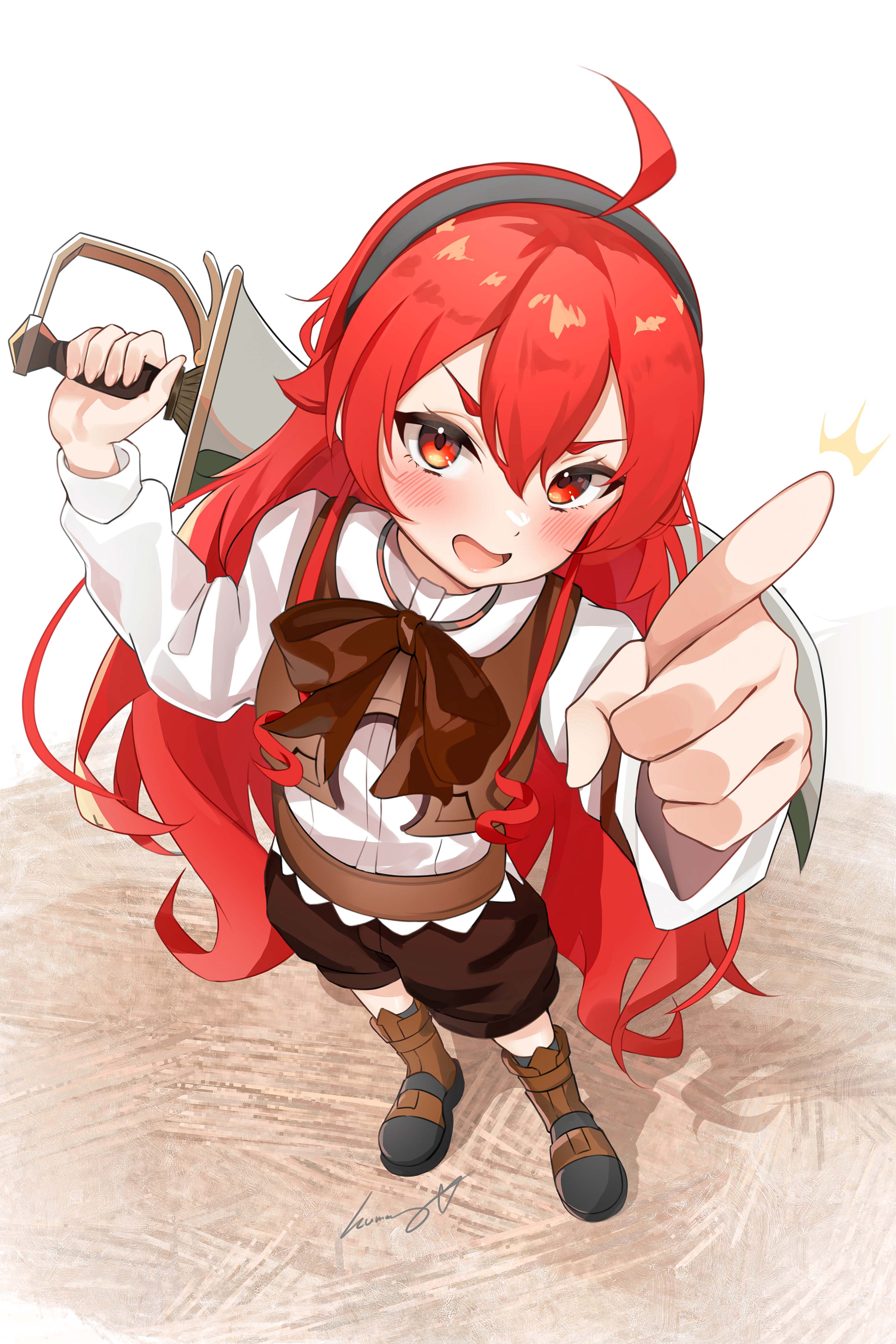 1girl absurdres ahoge arm_up black_hairband blush boots brown_shorts commentary_request eris_greyrat from_above full_body hair_between_eyes hairband hand_up highres holding holding_weapon humany long_hair long_sleeves looking_at_viewer mushoku_tensei open_mouth pointing pointing_at_viewer red_eyes red_hair shirt shorts smile solo standing weapon white_shirt