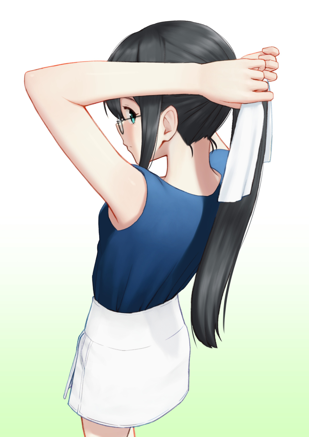 1girl adjusting_hair alternate_costume alternate_hairstyle arms_up black_hair blue_eyes blue_shirt closed_mouth commentary_request from_behind glasses gradient_background green_background hair_ribbon highres kantai_collection looking_at_viewer ooyodo_(kancolle) ooyodo_(lawson)_(kancolle) ponytail porupurucha profile ribbon shirt simple_background skirt sleeveless sleeveless_shirt solo white_background white_skirt