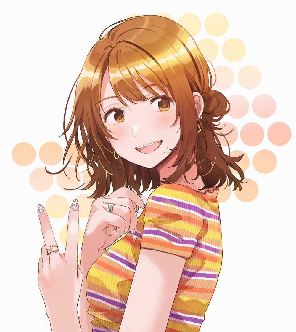 1girl :d blush brown_eyes brown_hair casual earrings fly_(marguerite) hair_bun inward_v izumi_yuzu jaku-chara_tomozaki-kun jewelry looking_at_viewer medium_hair official_art open_mouth orange_shirt ring shirt short_sleeves sidelocks single_side_bun smile solo striped_clothes striped_shirt teeth upper_body v white_background