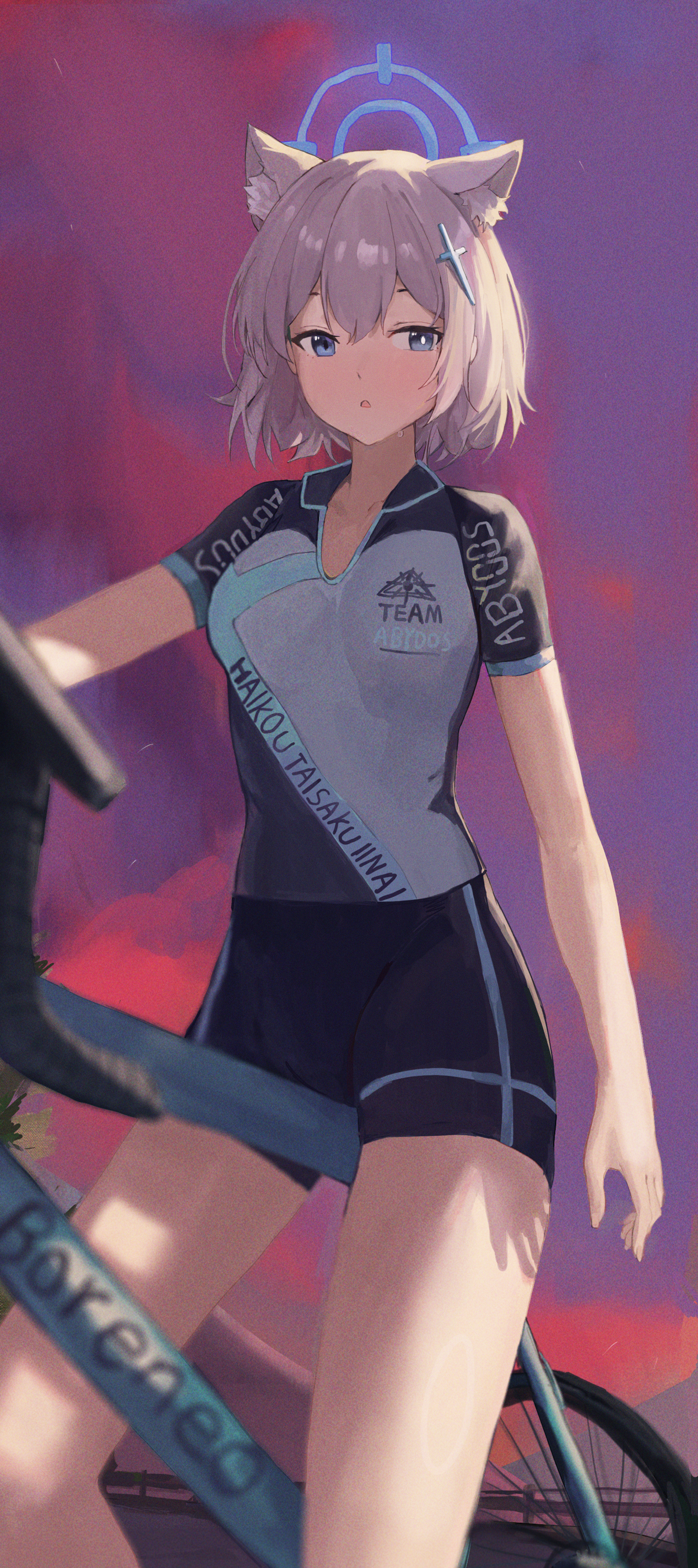 1girl absurdres animal_ear_fluff animal_ears bicycle bike_jersey bike_shorts blue_archive blue_eyes bright_pupils cloud commentary_request cross_hair_ornament cycling_uniform evening grey_hair hair_ornament highres jianjia mismatched_pupils official_alternate_costume open_mouth outdoors shiroko_(blue_archive) shiroko_(cycling)_(blue_archive) short_hair sky solo thighs white_pupils