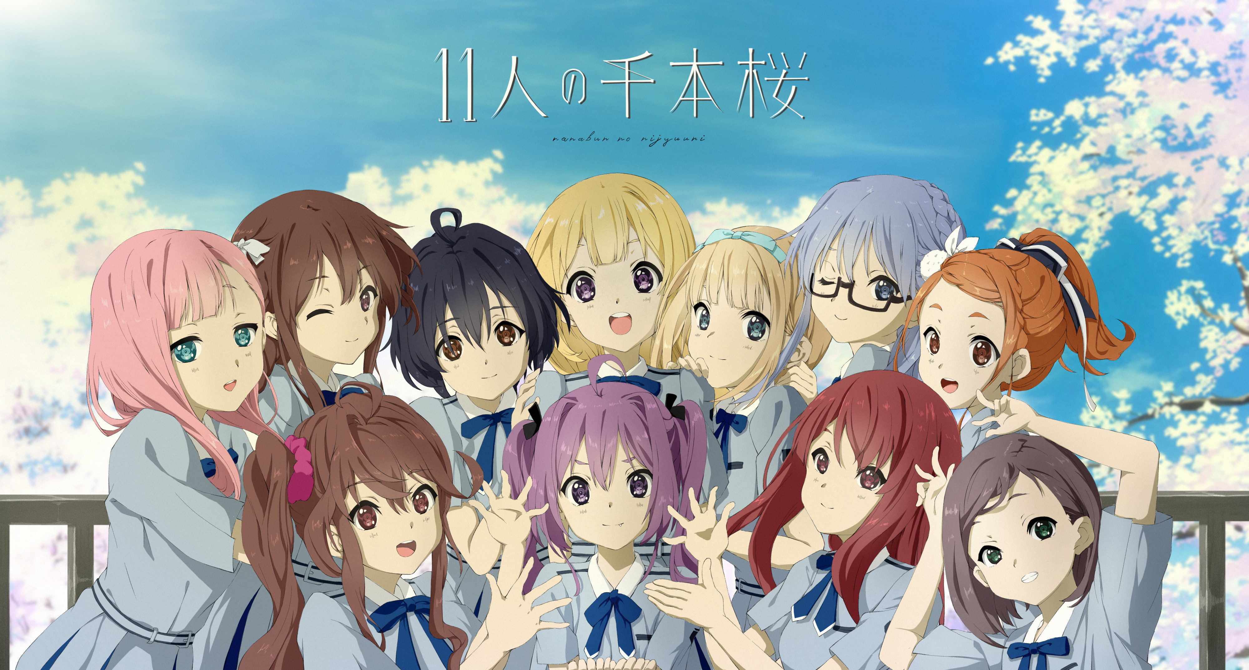 22/7 6+girls :d absurdres ahoge arms_up asymmetrical_hair black-framed_eyewear black_bow blonde_hair blue_bow blue_bowtie blue_dress blue_eyes blue_hair blunt_bangs blurry boku_wa_sonzai_shiteinakatta bow bowtie braid brown_eyes brown_hair cherry_tree closed_mouth dark_blue_hair depth_of_field double_w dress everyone fence fujima_sakura green_eyes grey_hair grin group_name hair_bow hair_ornament hair_ribbon hair_scrunchie hairband hand_on_another's_shoulder hands_up high_ponytail high_side_ponytail highres hiiragi_tsubomi kamiki_mikami kono_miyako light_blue_hair long_hair looking_at_viewer maruyama_akane_(22/7) medium_hair morinomiya_ruri multiple_girls one_eye_closed open_mouth orange_hair outdoors pink_hair pink_scrunchie ponytail purple_eyes purple_hair rectangular_eyewear red_hair ribbon saito_nicole sato_reika scrunchie semi-rimless_eyewear short_hair side_ponytail sidelocks single_braid smile tachikawa_ayaka takigawa_miu teeth toda_jun tojo_yuki twintails under-rim_eyewear upper_teeth_only w white_bow