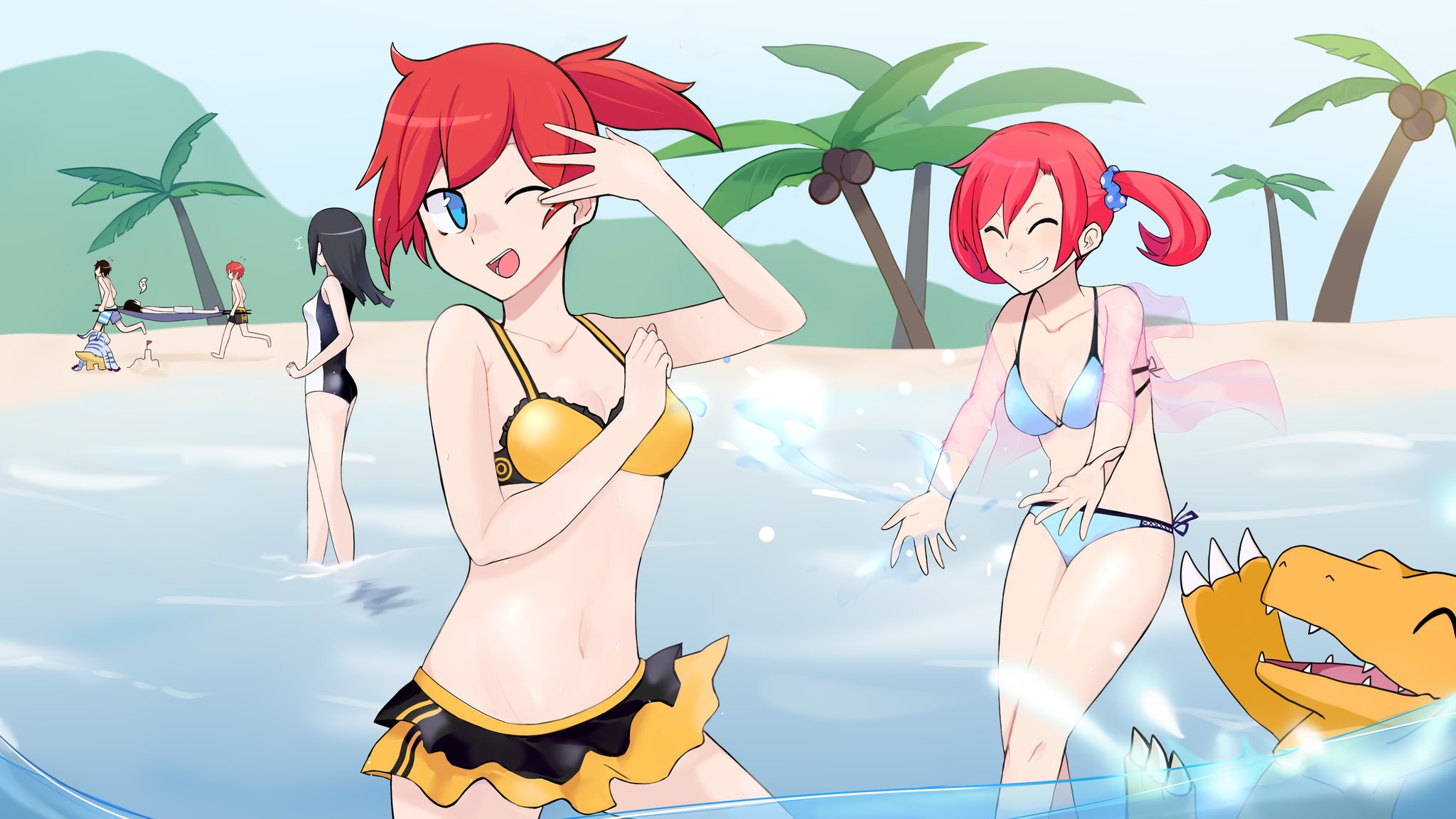 agumon aiba_ami aiba_takumi beach digimon digimon_(creature) gabumon highres kamishiro_yuugo kamishiro_yuuko oikawa_kurobaba sanada_arata sharp_teeth shiramine_nokia swimsuit teeth