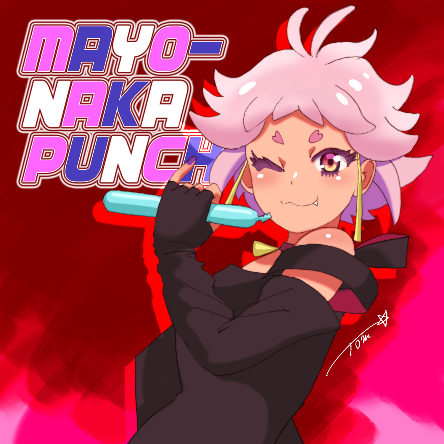 1girl black_gloves brown_eyes chutohampa copyright_name detached_sleeves elbow_gloves eyelashes gloves highres live_(mayonaka_punch) looking_at_viewer mayonaka_punch medium_hair one_eye_closed pink_hair purple_nails red_background solo tan vampire