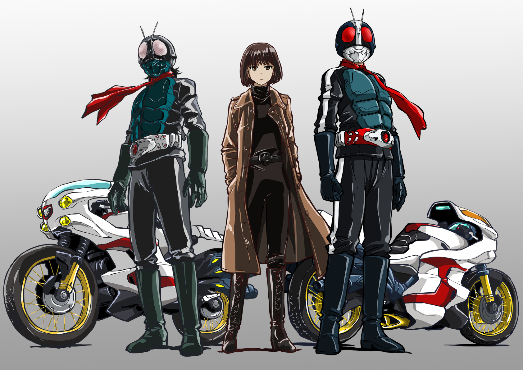 1girl 2boys armor belt black_gloves black_hair black_pants bodysuit boots bug coat compound_eyes cyclone_(kamen_rider) full_body gloves grasshopper green_armor green_gloves green_helmet grey_background helmet highres insect kamen_rider kamen_rider_1 kamen_rider_1_(shin) kamen_rider_2 kamen_rider_2_(shin) long_coat long_sleeves looking_at_viewer midorikawa_ruriko_(shin_kamen_rider) multiple_boys pants red_eyes red_scarf rider_belt scarf shin_kamen_rider short_hair taiga_hiroyuki tokusatsu trench_coat typhoon_(kamen_rider)