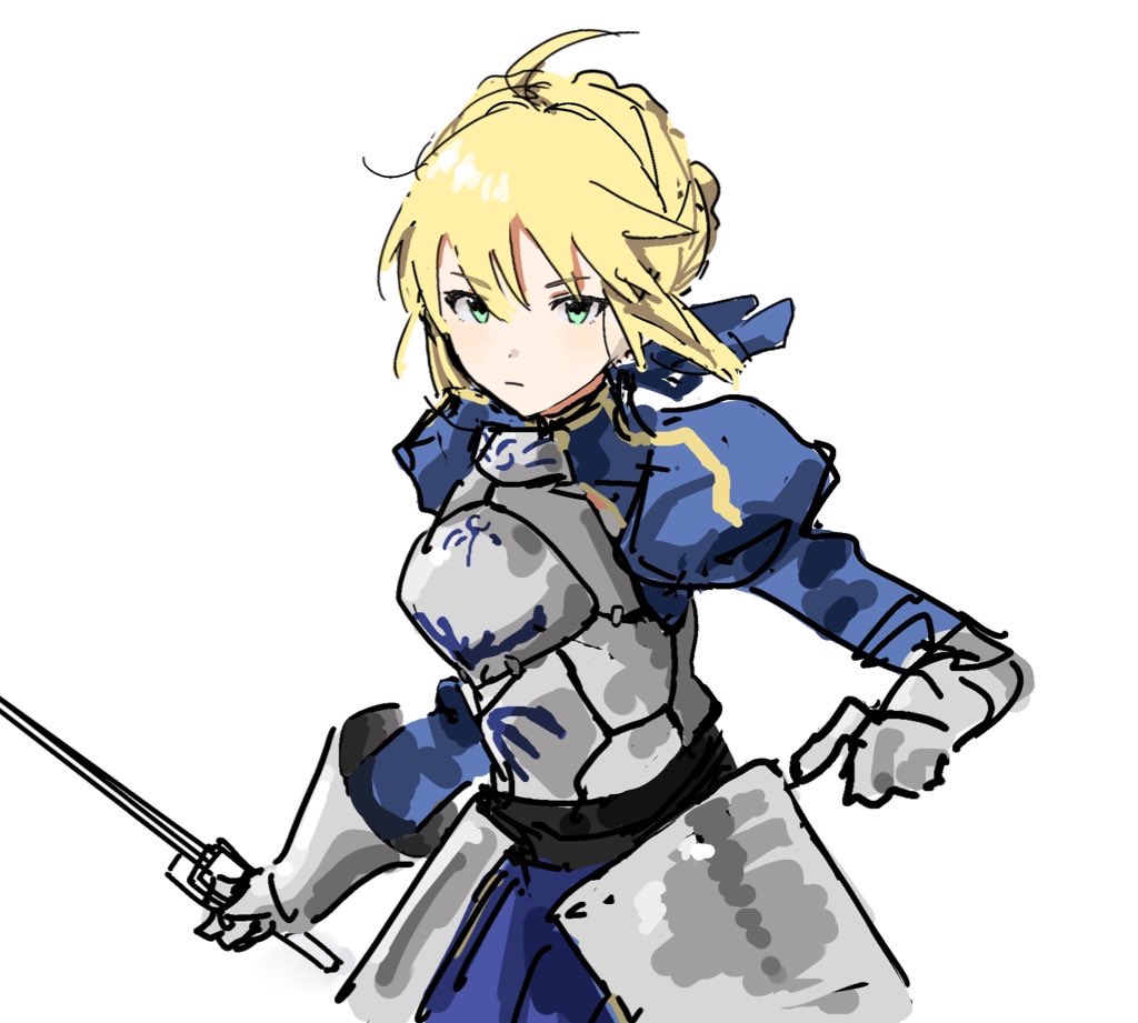 1girl ahoge aqua_eyes armor artoria_pendragon_(fate) belt black_belt blonde_hair blue_dress braid braided_bun dress fate/stay_night fate_(series) gauntlets hair_bun juliet_sleeves long_sleeves looking_at_viewer puffy_sleeves saber_(fate) sidelocks simple_background solo tomotenasi_e upper_body white_background
